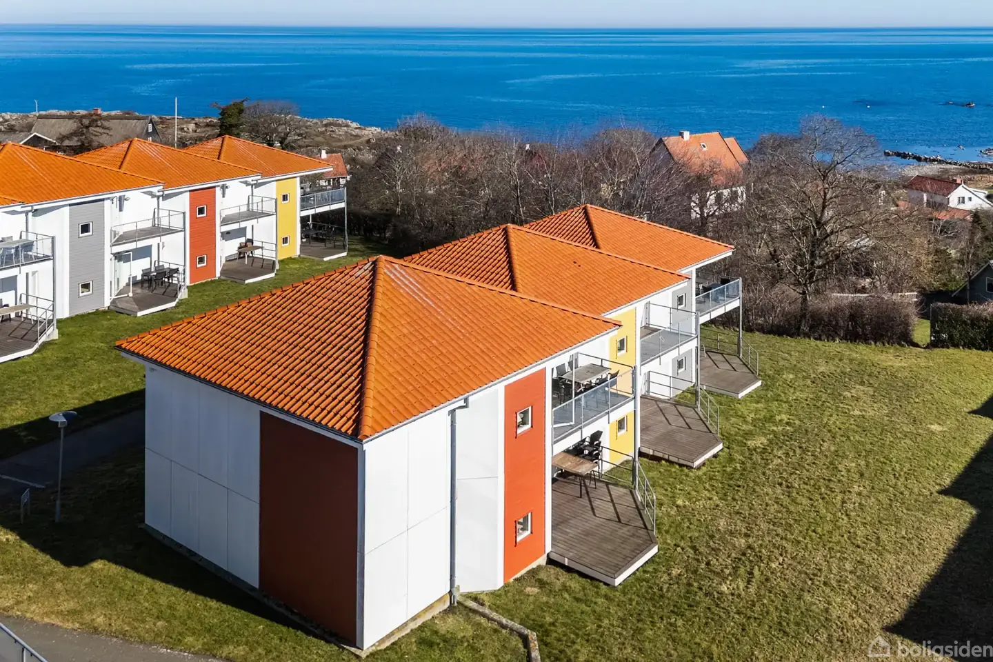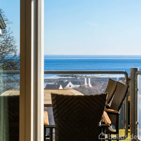 Feriebolig med altaner og flot kig til havet i GudhjemFerierne får gode betingelser her i Gudhjem. Ferieboligen ligger på første sal, hvor både havet og bylivet er tæt på. Allerede ved ankomsten mødes I af en altan ved indgangen, hvor du fra altanen kan se havet, og hvor dagen kan begynde stille med en kop kaffe.Fra entréen ligger et stort og lyst badeværelse på den ene side. Det fremstår pænt og tidssvarende med separat bruseniche og vaskemaskine, hvilket er rart efter en tur i vandet. Overfor