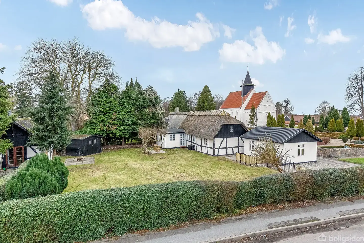 Idyllisk landsbyhus med stråtag og udsigt til kirketårnet