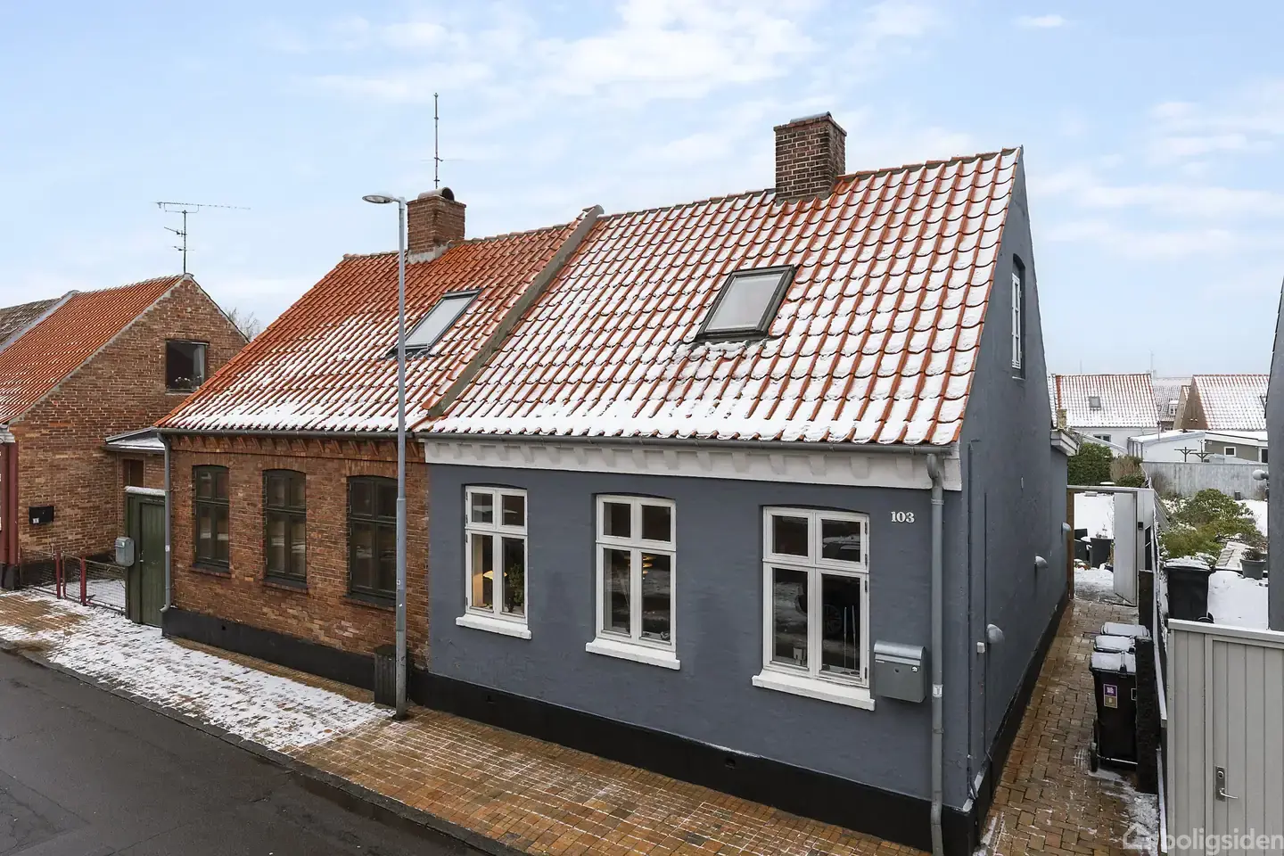 Indflytningsklart byhus med solrig have midt i RønneRønnes arkitektoniske udtryk udgøres af de mange byhuse, der fylder gadebilledet med varierende charmetræk, og her er Lille Madsegade 103 ingen undtagelse.Facaden er malet gråblå, og bag de hvide dannebrogsvinduer gemmer sig et gennemført hjem med en åben planløsning, der især henvender sig til singler og par, som kan flytte direkte ind og indrette sig på husets to etager.Stueplan er indrettet efter moderne forskrifter, for entré, køkken, alrum