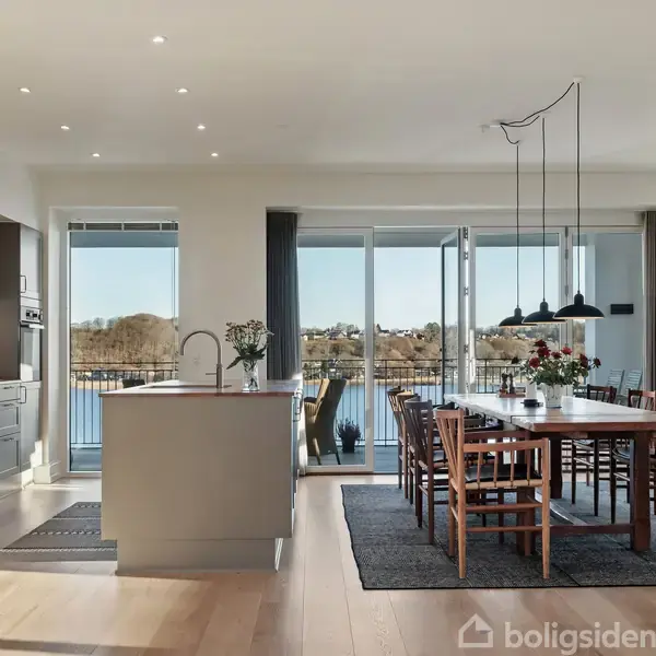 Her kan I tage elevatoren op til 4 sal og træde direkte ind i en af Skanderborgs mest eksklusive lejligheder, hvor udsigt, arkitektur og kompromisløs kvalitet går op i en højere enhed. Her bor du i første række til søen, højt hævet over byens tage og tilbagetrukket fra byens lydniveau, så du kan nyde panoramaudsigten i ro og mag. Det brede kig over vandet og de naturskønne omgivelser er ganske enkelt i en klasse for sig.Lejligheden byder på et imponerende køkken/alrum og stue i ét – et lyst og e