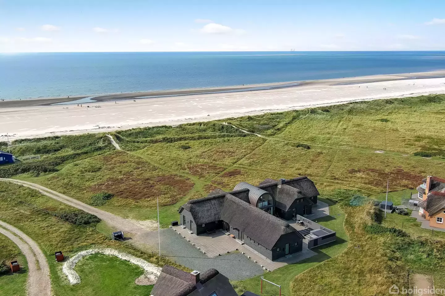Lille Strandvej 16 i Blåvand er blandt Danmarks bedste fritidshuse. Med en unik beliggenhed direkte ved kysten og en størrelse på 343 m² tilbyder denne ejendom en sjælden kombination af plads, kvalitet og udsigt.Det arkitekttegnet hus, som er opført i 2012, er designet med fokus på funktionalitet og æstetik. De 12 sovepladser fordeler sig på seks rummelige værelser og fire badeværelser, hvilket gør det ideelt til større familier eller gæster. Det store opholdsrum samler køkken, spiseområde, stue
