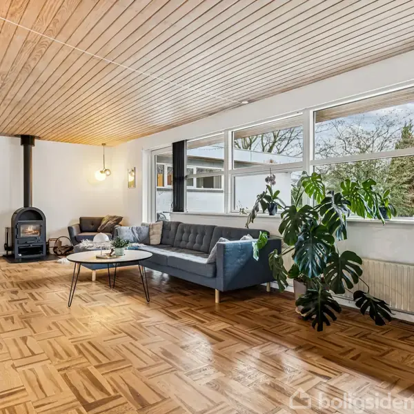 Velindrettet villa med funktionel planløsning Denne villa fra 1967 byder på 148 veludnyttede kvadratmeter og en gennemtænkt planløsning, der skaber en god balance mellem fælles opholdsrum og private værelser. De store vinduespartier giver et behageligt lysindfald og en fin sammenhæng mellem inde- og uderum. Boligen fremstår solid og funktionel og giver et godt udgangspunkt for at skabe et hjem efter egne ønsker.Lyse opholdsrum med direkte adgang til terrasse Boligen byder på en indbydende entré,