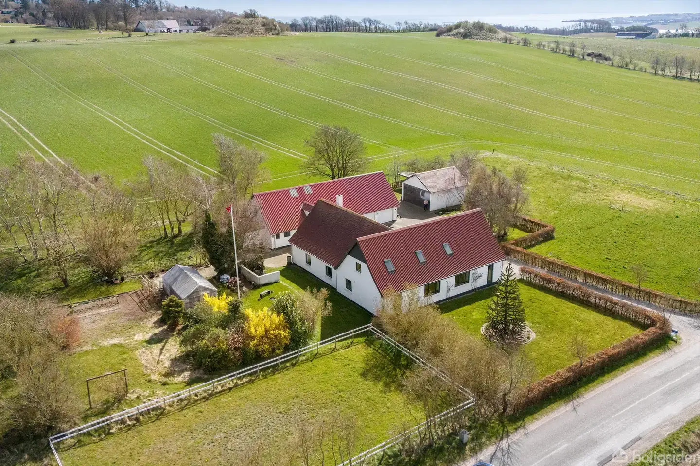 Ejendom med unik panoramaudsigt over natur og hav – et fredfyldt fristed med plads til fællesskab og selvforsyning Drømmer du om at vågne op til fuglesang, åbne vinduerne og lade blikket glide ud over åbne marker og glitrende vand? Så byder denne charmerende ejendom på Lindhøjvej 3 den perfekte ramme om et liv i ro og naturskønne omgivelser – kun kort afstand til vandet og omgivet af bølgende marker. Ejendommen præsenterer sig med et smukt og klassisk udtryk med hvid facade og rødt tag og byder på en veldisponeret planløsning med masser af plads til både familieliv, gæster – eller flere generationer under samme tag. Stueplanet rummer hele fem værelser, et badeværelse og flere opholdsrum, hvoraf den rummelige stue/spisestue skaber et naturligt samlingspunkt med direkte adgang til køkkenet. Her er også et praktisk bryggers, entré og et gæstetoilet. Fra flere af rummene er der udgang til haven og den skønne gårdsplads. På førstesalen finder du en kæmpe stor, lys stue med stort vinduesparti, så du virkelig kan nyde den formidable udsigt. Derudover er der et åbent loftsrum med mange anvendelsesmuligheder – oplagt som hobbyrum, kontor, atelier eller ekstra opholdsareal. Udenfor venter en idyllisk og frodig have med gamle træer, blomstrende buske og hyggelige kroge. Her er masser af plads til både boldspil, havedrømme og afslapning i solen – og for dig, der drømmer om en mere selvforsynende livsstil, er der gode muligheder for at etablere køkkenhave, drivhus og frugttræer. Grunden grænser op til åbne marker, og den høje beliggenhed sikrer en uforstyrret udsigt over landskabet og havet i horisonten – et sjældent syn, der skal opleves. Til ejendommen hører flere udbygninger, herunder et maskinhus, et hønsehus og en staldbygning med indrettede hestebokse – ideelt til dig, der ønsker at holde heste, høns, geder eller andre dyr. Derudover er der også en ridebane i baghaven, som gør ejendommen oplagt for den hesteinteresserede familie. Denne bolig er perfekt til dig, der søger et liv i pagt med naturen – med plads til både fællesskab, frihed og fordybelse. Her får du en sjælden kombination af charme, udsigt og funktionalitet i landlige og fredelige omgivelser.