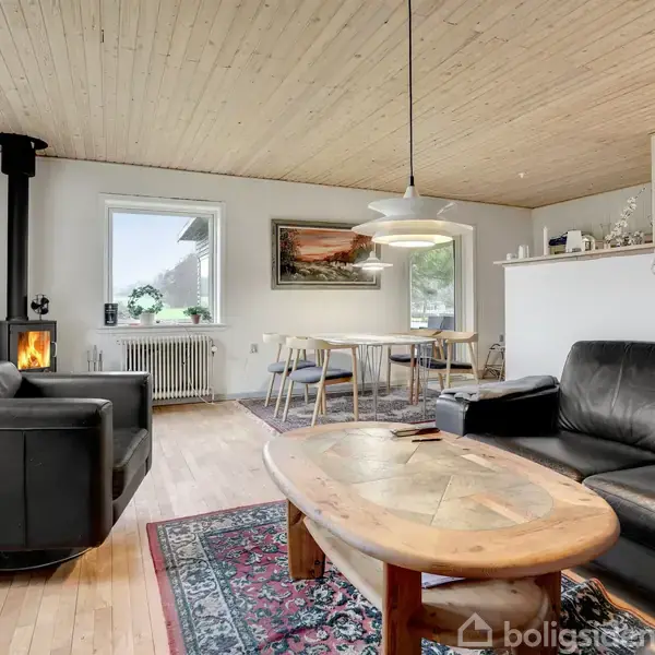 Velkommen til en velindrettet bolig, der byder på både funktionelle løsninger, lyse opholdsrum og gode disponible arealer. Huset har en attraktiv planløsning i stueplan og en rummelig kælder, der giver mange anvendelsesmuligheder.StueplanBoligens hjerte er det store, lyse opholdsafsnit bestående af stue og alrum, som ligger i åben forbindelse til køkkenet. Her er der god plads til både spiseafdeling og hyggelige opholdszoner – og fra alrummet er der direkte udgang til en dejlig overdækket terra