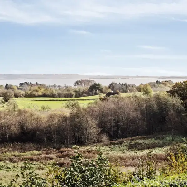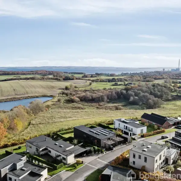 På Løgten Østervej 76 i Skødstrup venter en helt særlig villa, hvor arkitektur, materialevalg og natur smelter sammen i en smuk helhed. Boligen er opført i 2017 og fremstår med gennemførte detaljer, et tidløst formsprog og en beliggenhed, der byder på uforstyrret udsigt over det åbne landskab og Kalø Vig – en sjælden kombination af æstetik, ro og komfort.De store vinduespartier udgør boligens naturlige omdrejningspunkt og inviterer dagslyset langt ind i rummene, hvor stemningen ændrer sig i takt