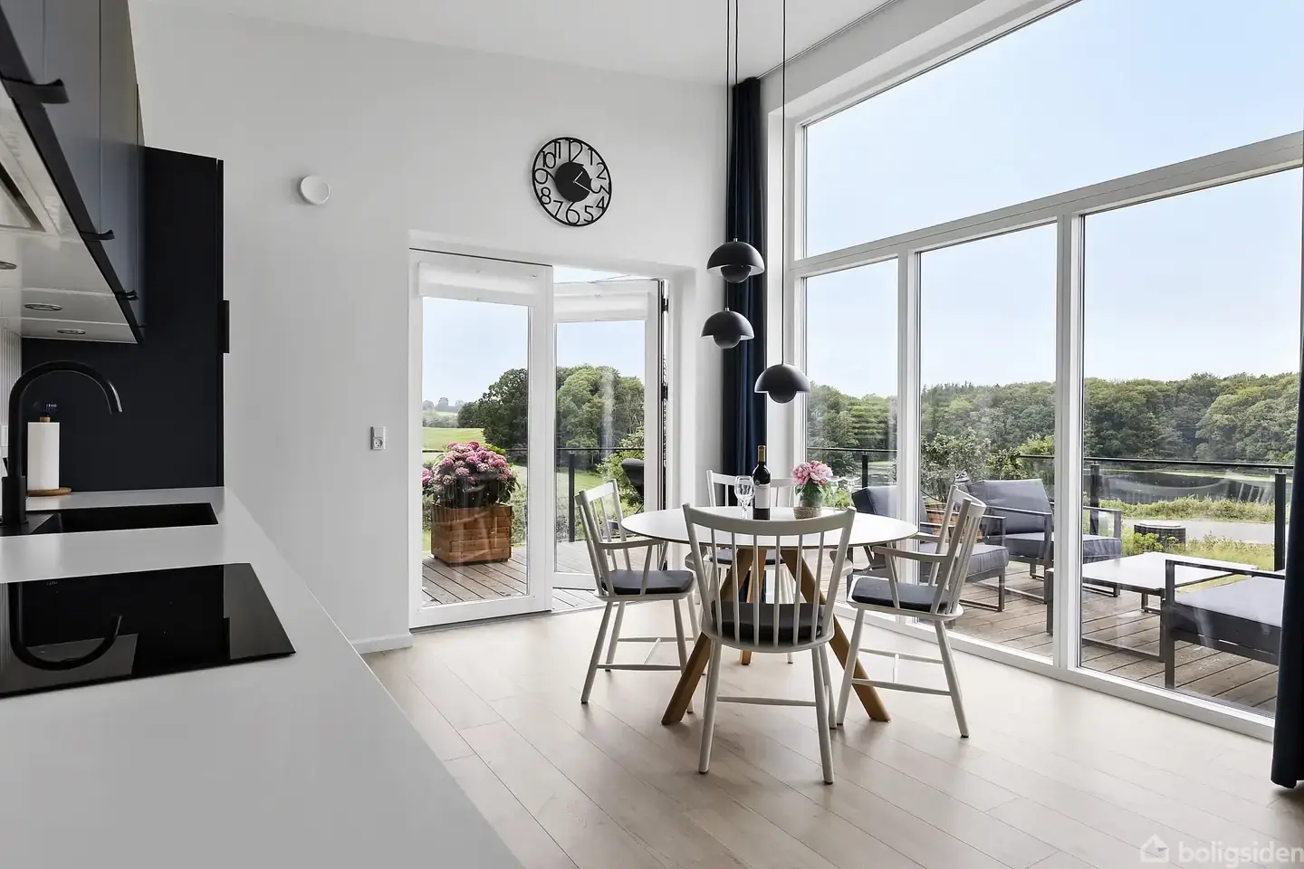 I et roligt område lige i smørhullet mellem Sandskær Strand, Aabenraa Golfklub og Nørreskov finder I dette flotte fritidshus i to plan, som har en god indretning og en udsigt, der siger spar to. Fra husets enorme vinduespartier og den store, hævede terrasse kan I nemlig nyde et helt uspoleret udsyn til skoven, skovsøen og de frie, grønne arealer omkring. Huset ligger for enden af en blind vej, og der er ingen huse foran, så udsigten er ganske fri. Med skoven som bagtæppe kan I se årstiderne skif