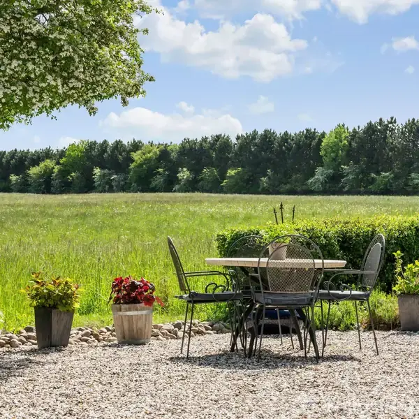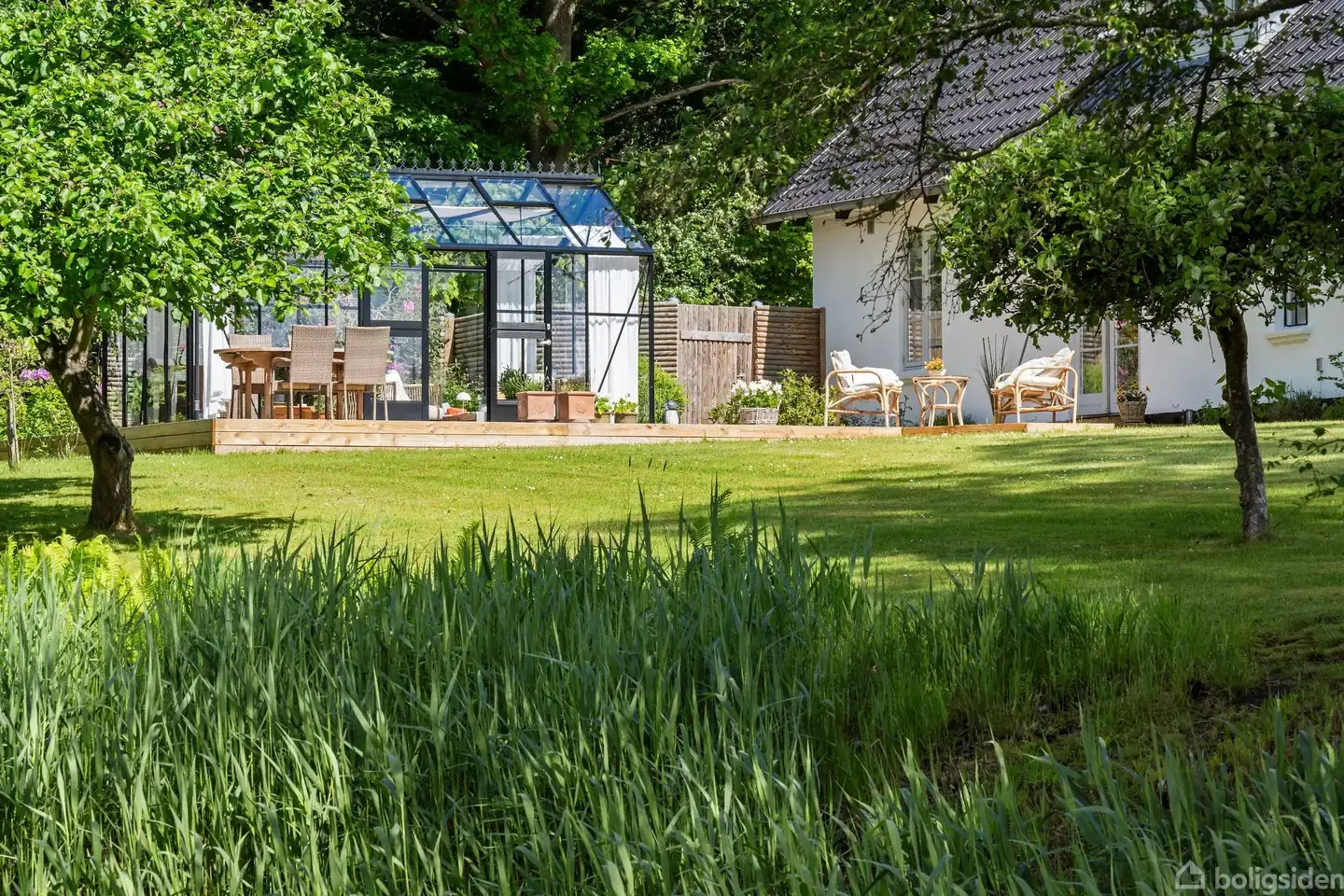 Man skal kunne lide det, roen og freden. Selv om der kun er 5 minutter til motorvejen og 3 minutter til indkøb og skoler, så er her helt roligt. Naboerne er der, med hjælpsomhed efter behov, men man ser dem ikke. Til gengæld ses naturen i fuld udfoldelse på den store hømark, der grænser op til grundens 3282 m2. Og juletræet? Det kan være 5 meter højt næste juleaften. For i 1897 byggede den lokale herremand huset og donerede det til missionsforeningen, som brugte det til missionshus og forsamlingssted for området. Den gamle vandværksmester har såmænd danset om juletræet der i 1966, årtier før det blev en 190 m2 stor familiebolig med stort nyt orangeri og overdækket terrasse og trædæk i hele husets længde. Det er svært at blive træt af sådan en udsigt. Rådyrene, der kommer på besøg hver dag. Vidderne, lige på den anden side af hækken. Haven er stor og lige nu nem, med græsplæne og egen lille sø med lejlighedsvise ænder. Det kunne hurtigt blive til et velholdt blomsterhav. Men man behøver ikke forandre noget, for marken, den der udelukkende bruges til hø, leverer skønhed og dyreliv, så det bogstavelig talt basker. Når høet slås, og ballepresseren arbejder, svirrer luften med musvåger, glenter og lignende, der er klar til at slå ned på musene. Som aftenen falder på, erstattes de af hoppende ræve og lydløse ugler. I stolen på terrassen har man gratis første parket til naturens gang. Fredensborg er byen, når der skal købes dagligvarer, sendes børn i skole og institution, slentres gennem gågaden med de mange butikker, eller spise lækkert på de gode restauranter. Har man royale tilbøjeligheder, er det også her kongefamilien til tider har residens. Det hedder sig, at de også holder af luksus ved naturen.