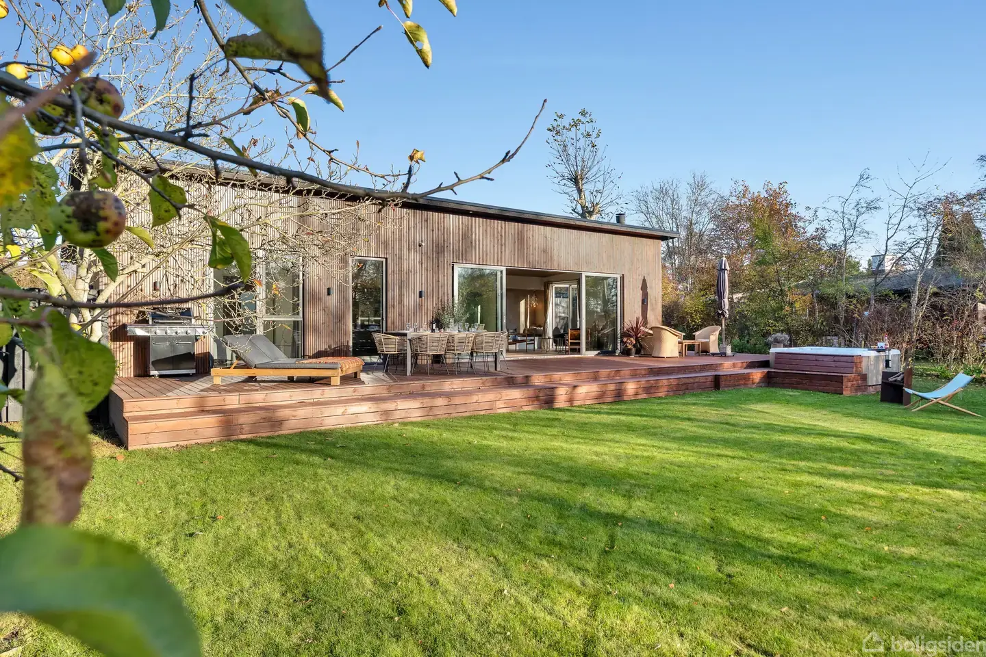 Velkommen til Lundedalsvej 4 i Vejby – et sjældent smukt og gennemført sommerhus, hvor moderne arkitektur og naturskøn idyl går hånd i hånd. Her får du et fristed, der taler til sanserne, designet med omtanke for både æstetik, komfort og naturens rytme. Allerede ved ankomsten fornemmer man roen. Huset ligger diskret placeret på en stor, solrig grund på 1.200 m², omgivet af grønne træer og fuglefløjt – og med Kattegat kun få minutters gang væk. Den smukke træfacade falder naturligt ind i omgivels