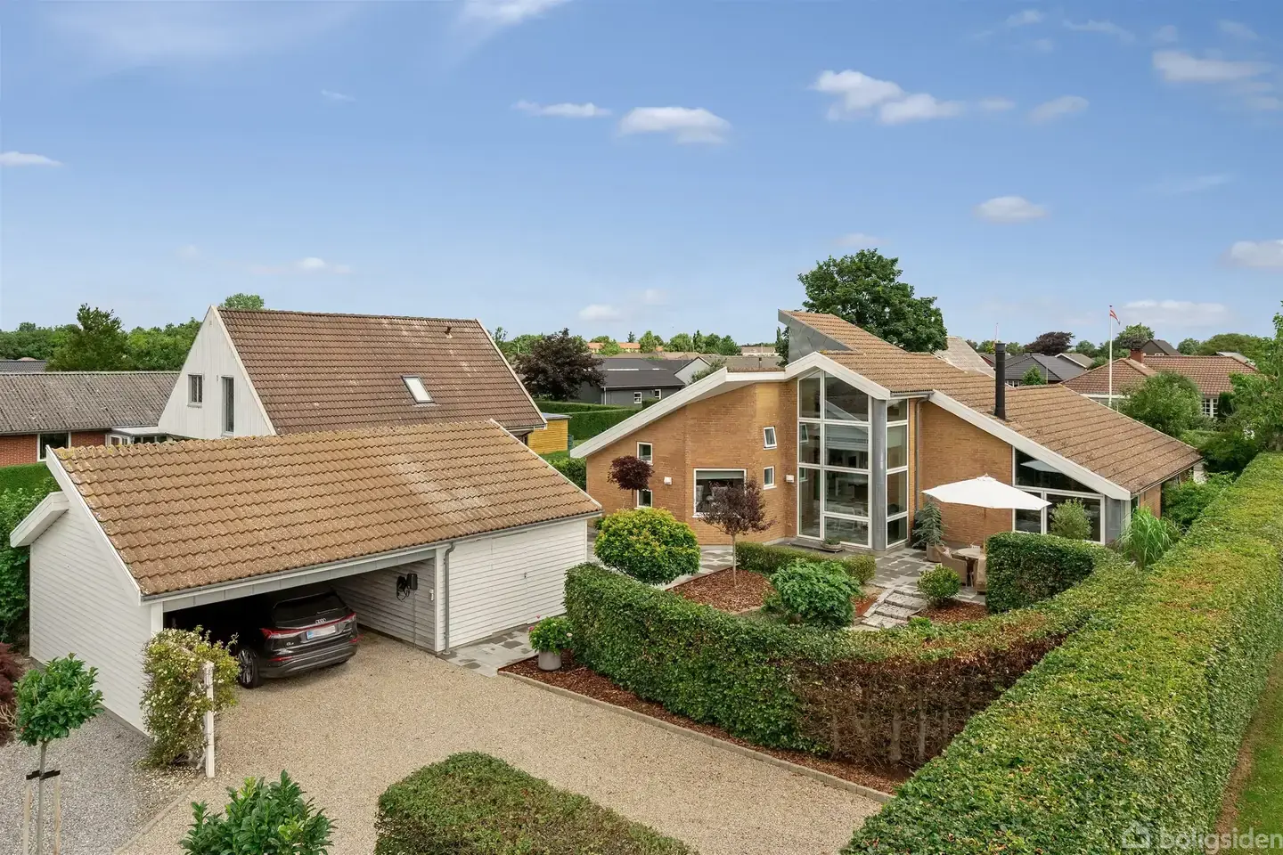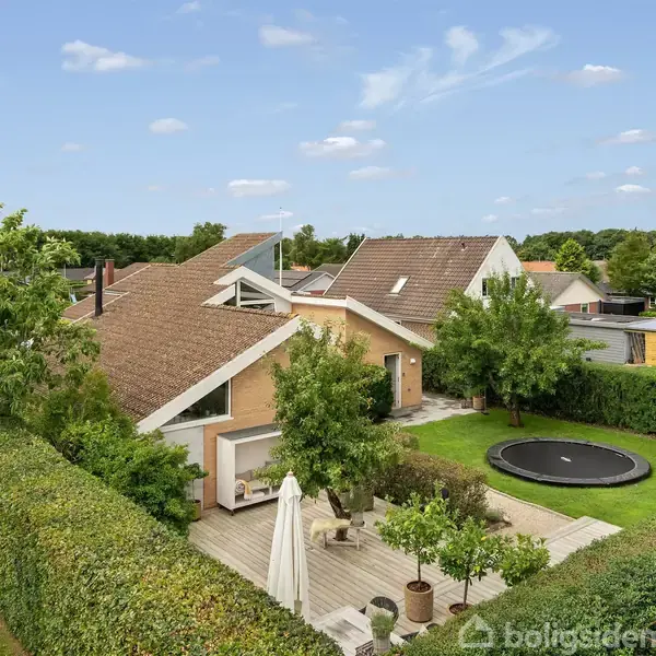 Åbent hus med tilmeldingskrav 10/2 - klik på billede - Denne arkitekttegnede villa har en børnevenlig og tryg beliggenhed på Lupinvænget i Varde. Herfra er der kort gåafstand til skole og fritidsaktiviteter, mens indkøbene klares let i Netto, Varde Centret og centrum. Villaen er opført i moderne byggestil med en indretning, der sætter familieliv, lys og rumoplevelse i centrum. Ejendommen er tegnet af arkitekt Steen Mathiesen, der gennem årene har stået bag flere markante byggerier. Dette er ingen undtagelse. Villaen præsenterer sig i et moderne formsprog med store glaspartier. Inde får man straks lyst til at gå på opdagelse i de mange rum med spændende vinkler. Lyset strømmer uhindret ind gennem de store vinduer og skaber en behagelig atmosfære. Karakteristisk er det åbne alrum med glaspartier i bygningens fulde højde og åben etageadskillelse samt køkkenet, som oplyses af ovenlysvinduer. Køkkenet er topmoderne med hvide elementer og en smuk ø i lyst træ med tapsamlinger. Fra alrummet er der åben forbindelse til en let sænket stue med brændeovn, loft til kip og høje vinduer under den ensidige taghældning. Stue og køkken-alrum har brede plankegulve i lyst træ og direkte udgang til haven. Huset rummer desuden tre værelser og et bryggers - og også her gemmer arkitekturen på finurlige detaljer og "hemmeligheder". I forlængelse af stuen ligger et stort master bedroom med loft til kip, indbyggede skabe og privat badeværelse med sauna. De to øvrige værelser ligger i en særskilt børneafdeling med adgang fra alrummet - begge med hemse og kig til fællesarealerne. Den åbne etageadskillelse skaber kontakt til førstesalen - en stor hems, som er oplagt til kontor eller ekstra stue med fin udsigt over kvarteret. Udenfor kan I nyde solen og roen i fulde drag i den store, skønne have. Villaens arkitektoniske udtryk er ført igennem her med flere terrasser og kroge - bl.a. en sænket solterrasse i læ af hæk og afrundet stensætning. Til villaen hører også en 46 m2 stor carport med redskabsrum samt en grusbelagt indkørsel med god plads til gæster. Villaen er ikke blot gennemtænkt i sit arkitektoniske udtryk - den er også opført som en komfortabel og funktionel ramme om hverdagen. Glæd jer til at opleve rumfornemmelsen, lyset og de mange spændende løsninger, der kendetegner Lupinvænget 2.