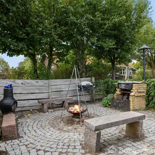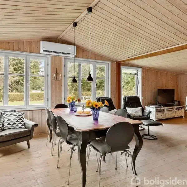 Drømmer I om ferier og forlængede weekender i familievenlige rammer med hyggelige strandstunder og spændende natur? Så kunne I overveje dette charmerende fritidshus, der ligger på en 1.119 kvadratmeter lukket grund i et roligt og børnevenligt område i Hønsinge Lyng. Huset disponerer over 90 veldisponerede kvadratmeter, og med det tilhørende anneks får I hele otte regulære sovepladser. Fra den eftertragtede sommerhusadresse tager det kun på den gode side af et kvarter at gå ned til Sejerøbugten via områdets stier og små, rolige veje. Ved bugten finder I den lækre badestrand, hvor I kan slå jer ned i det bløde sand mellem de fine, hvide klitter, og da stranden er meget lavvandet, kan selv de alleryngste være med. På vejen herned krydser I revlerne, hvor I kan hilse på de søde Gallowaykøer, der går og græsser, og derudover kan I nyde områdets skønne natur med lagune og vadehavsfugle. Jyderup Skov ligger også kun en rask spadseretur væk, og tager I cyklerne, kan I tage et smut forbi udsigtspunktet ved Høve Stræde og nyde et flot, langt udsyn over bugten og de smukkeste solnedgange i vandhorisonten. I brugsforeningen på Lyngvej kan I købe alt det vigtigste ind, mens det kun tager fem minutter i bil at nå til Vig, hvor der er svømmehal, bibliotek og to gode supermarkeder. Når I ikke nyder områdets skønne strande og varierede natur, kan I slappe af hjemme på matriklen, hvor I finder to store solterrasser, en legevenlig græsplæne og en hyggelig bålplads. Her kan I bage pandekager og snobrød med de yngste, der sammen med hunde kan løbe frit omkring, da grunden er lukket hele vejen rundt. I indkørslen er der plads til at flere biler kan holde parkeret, og når er I mange mennesker samlet, kan I søge hen på grundejerforeningens store, grønne fællesområde til et slag rundbold. Her kan I også roligt tage for jer af frugterne, der vokser på arealets æbletræer. De blå træhus blev opført i 2002 og tilbygget i 2007, hvor stuen blev udvidet og et tredje værelse kom til. Huset er meget velfungerende, og indretningen er ideel til en familie med børn, mens gæster og teenagere kan få annekset for sig selv. I den store stue kan I samles til hyggelige spilaftener, og med udestuen kan I tage forskud på sommeren. Der er også et brusebadeværelse og et køkkenalrum med en dør direkte ud til den overdækkede del af terrassen.