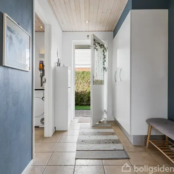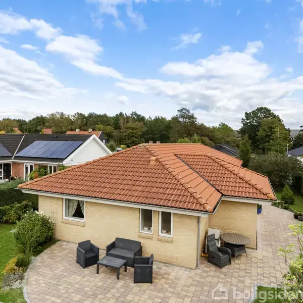 Villa i ét plan på 157 m² ligger i et stille, familievenligt kvarter og giver et klart førsteindtryk med rødt tegltag og velholdt facade. Boligen er 157 m², rummer 4 værelser og er opført i 2012 på en 740 m² grund, hvilket giver god plads til både fællesliv og privatliv. Indkørsel med carport og et praktisk skur afslører et hjem, hvor funktionalitet er i højsæde. Indretningen er veldisponeret med klare zoner til hverdag og samvær. Entréen har klinkegulv og indbyggede skabe, og husets bryggers/te