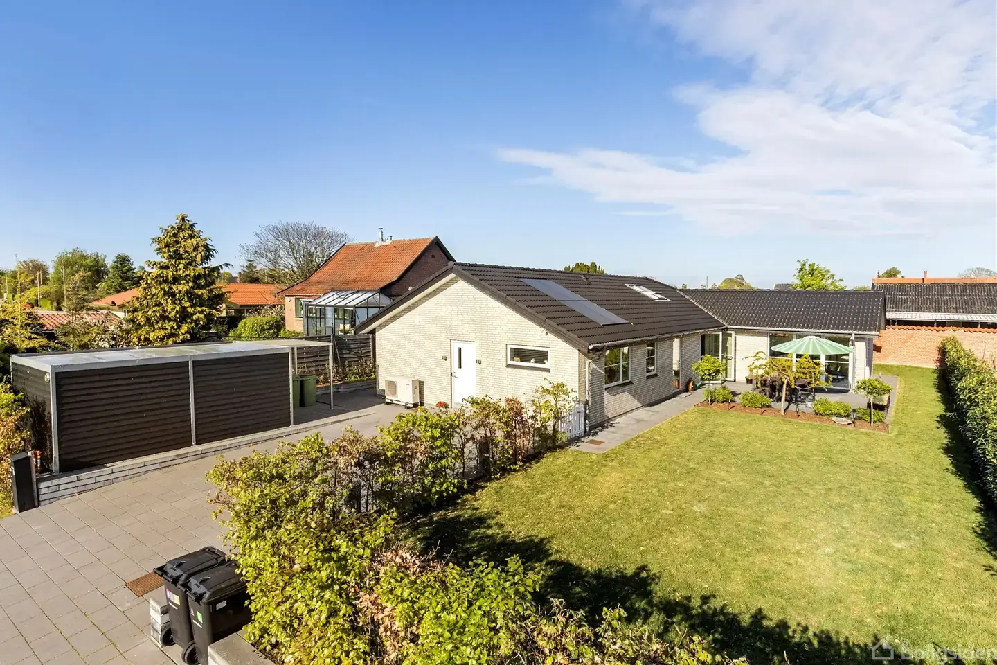 Åbent hus med tilmeldingskrav 8/2 - klik på billede - For enden af en rolig og lukket villavej udbydes dette vinkelhus fra 2020. Med hele 182 m² og en gennemtænkt planløsning får I her et moderne og funktionelt hjem, der skaber optimale rammer for familielivet. Boligens leverum imponerer med loft til kip, som giver en fantastisk rumfornemmelse og et smukt lysindfald. I værelserne er der ligeledes god loftshøjde og behagelige, lyse rum. Idag er der 3 værelser men det ene rum er opført med henblik på at opdele det, så der ialt vil være 4. Overalt i huset er der gulvvarme, som sikrer høj komfort året rundt. Materialevalget er både stilrent og kvalitetsbevidst. I entré, bryggers, badeværelser og køkken/alrum er der italienske gulvfliser, mens stue og værelser er udført med flotte egeparketgulve. Køkkenet er fra HTH og fremstår moderne og funktionelt med integreret Quooker “Fusion Round”, som naturligvis medfølger. Vinduerne er fra Rationel og er udstyret med solglas mod syd og vest, hvilket bidrager til et behageligt indeklima. Derudover er der Velux ovenlysvinduer med regnsensor. Huset har Nilan Comfort ventilationsanlæg i hele boligen samt centralstøvsuger – gennemtænkte løsninger, der gør hverdagen både sundere og nemmere. Haven er ugeneret og optimalt orienteret, så solen kan nydes hele dagen – perfekt til både leg, afslapning og hyggelige stunder på terrassen. Til elbilsejeren er der installeret Clever-lader, som kan medfølge, såfremt køber overtager abonnement og den opsatte lader. Der er desuden kabel-TV installeret. Beliggenheden er særdeles attraktiv for børnefamilien. Den lukkede villavej skaber et trygt miljø for legende børn, og området byder på gode og sikre stisystemer til skole og institutioner. Samtidig er der kort afstand til svømmehal samt fritidsaktiviteter som fodbold og badminton. En moderne, indflytningsklar villa med fokus på komfort, kvalitet og familieliv – beliggende i rolige og børnevenlige omgivelser.