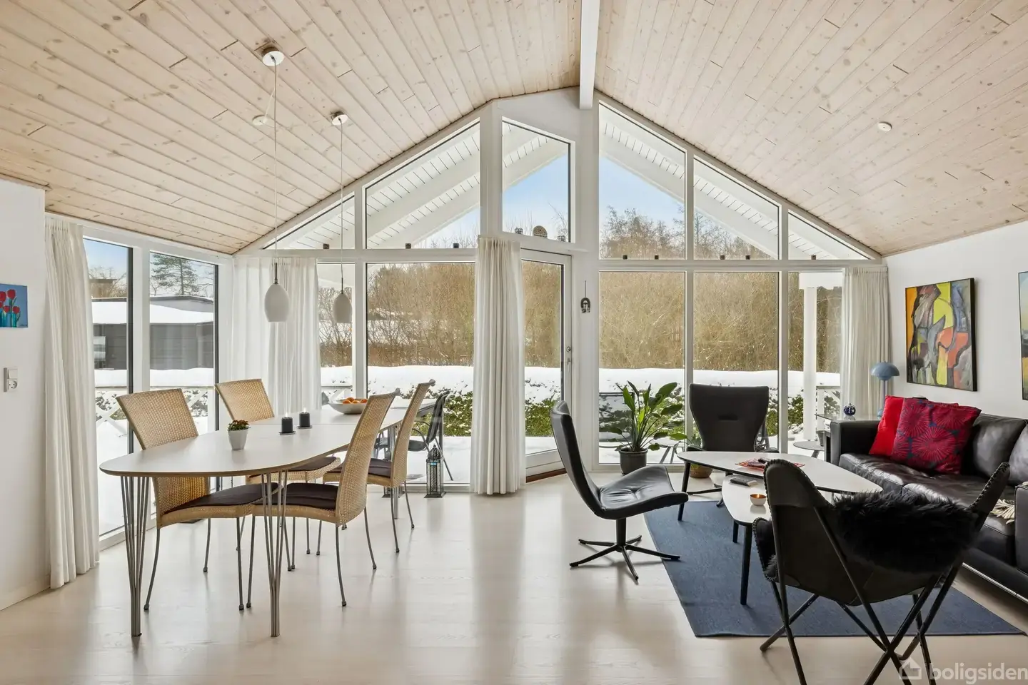 EJENDOM Lad boligjagten ende lykkeligt i rammerne af et yderst velholdt etplanshus, der ligger indhyllet i smuk natur. Skoven bliver en af jeres nærmeste naboer, mens I kan gå til stranden og cykle til stemningsfulde Ebeltoft. Her vil I straks føle jer hjemme. I overtager nøglerne til et flot Skanlux-hus fra 2012, så I får et hjem med moderne komfort, og det kan desuden nævnes, at der er installeret jordvarmeanlæg. Huset er opført i ét velindrettet plan, der er lyst og venligt fra start til slut. På den anden side af hoveddøren er det en nydelig entré, der tager imod jer, og entréen giver jer en smagsprøve på et indbydende hjem med pæne, tidløse materialevalg. Pladsen er godt fordelt på bl.a. et praktisk bryggers, hele to badeværelser samt tre værelser med indbyggede skabe. Alt det bindes sammen af nogle dejlige opholdsrum med højt til loftet og fokus på samværet. Hjemmets naturlige samlingspunkt bliver det åbne køkken-alrum, hvor I kan lægge sidste hånd på en lækker middag, mens I nyder udsigt til ild i brændeovnen og gæsterne, der slår sig ned omkring spisebordet. Rummet fuldendes af karnappens store vinduespartier, der løber fra gulv til loft og dermed lader lyset strømme ind, mens de samtidig giver fri udsigt til alt det grønne omkring jer. Senere kan I rykke ind i dagligstuen, hvorfra I også kan tilgå en hems, der sætter en hyggelig prik over i’et. Huset er opført på en 1.135 kvadratmeter stor grund, så der er dejligt med luft omkring jer og god plads til udelivet i den solrige have. Fra alrummet træder I direkte ud på en stor terrasse, der er delvist overdækket, så her kan I både nyde de mange soltimer og rykke i læ for duggen. Som en praktisk detalje er der også udhus og carport under samme tag som huset. BELIGGENHED Drømmer I om et hjem, hvor naturen nærmest banker på jeres hoveddør? Så er det her, I skal bo. Huset ligger i fred og ro på et lukket vænge i et flot kuperet landskab, hvor skoven lægger sig fint mellem husene, og lige om hjørnet starter naturstien, som leder jer videre ud i natuen. I bor i et område uden lysforurening, så I kan se frem til synet af en stjerneklar nattehimmel, og I kan gå til Vibæk Strand, hvor I både kan bade, windsurfe og runde dagen af i selskab af smukke solnedgange. Alt det kombineres med den korte afstand til Ebeltofts hyggelige bymidte, hvor I finder alt, hvad I kan ønske jer af butikker, indkøb, spisesteder og havneliv.