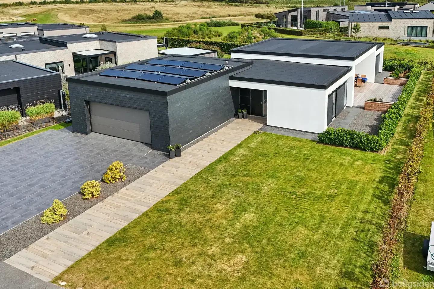 EKSKLUSIV ARKITEKTTEGNET VILLA I HJERTING - KOMPROMISLØS KVALITETI det attraktive Hjerting finder du denne unikke og nyopførte villa fra 2022, hvor intet er overladt til tilfældighederne. Huset er tegnet af Lolk Tegnestue i Esbjerg og fremstår som et moderne mesterværk, hvor kvalitet, funktionalitet og æstetik går hånd i hånd. Med sine 197 m² bolig og en integreret garage på hele 86 m², placeret på en 932 m² grund, får du en ejendom, der imponerer både ude og inde. Villaen er opført med eksklu