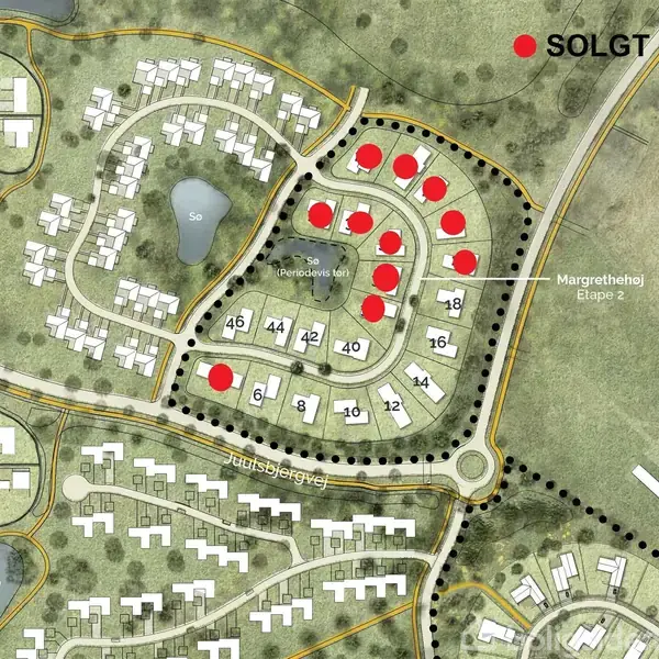 Åbent hus med tilmeldingskrav 10/12 - klik på billede - På Margrethehøj udbydes nu en ny grundudstykning bestående af 22 naturskønt beliggende byggegrunde. Allerede nu er halvdelen solgt, så vil du sikre dig en grund i denne skønne udstykning og bygge dit drømmehus, er det nu, du skal slå til.Kontakt indehaver Brian Bjerring Andersen, EDC Domus på tlf. 7582 2522 eller mail: [email protected] , for at reservere din drømmegrund. Du er naturligvis også velkommen til at ringe hvis du har spørgsmål eller ønsker en fremvisning af denne skønne udstykning.Udstykningen er udformet som en hestesko, hvor søen i midten danner det naturlige omdrejningspunkt. Grundene er placeret med optimale solforhold, og området er en del af det eftertragtede boligområde Tirsbæk Bakker. Her finder du flere søer, grønne friarealer og unikke stisystemer i skoven – en naturoplevelse, som ikke findes i nogen anden udstykning i Vejle. Stierne forbinder områderne smukt, så du kan færdes trygt i hele området og gå gennem skovarealerne helt ned til Tirsbæk Gods og Vejle Fjord.Området er ideelt for dig, der ønsker luft, ro og natur til alle sider, samtidig med kort afstand til indkøb, skole og institutioner. Tirsbæk Bakker byder på både kuperet terræn, søer, stier og generelt god luft mellem villaerne. Samtidig med at meget af den eksisterende natur er bevaret, hvilket giver området et smukt og etableret udtryk.Kombinationen af privatliv og fællesskab gør Tirsbæk Bakker til noget helt særligt. Uanset om det er en sommermorgen eller en efterårsdag, er naturen her i konstant forandring – en forandring, du kommer tættere på end de fleste boligejere tør drømme om.Nærområde:- Indkøb i Bredballe Centret – 5 min. kørsel- Shopping i Vejle Centrum – 12 min. kørsel- Skoler i området, Hældagerskolen, Kirkebakkeskolen, Bredballe Privatskole samt Engum Skole i Bredal- Integreret daginstitution med vuggestue, børnehave og fælleshus i nærområdet- Offentlig transport: busrute direkte fra Tirsbæk Bakker til Vejle Centrum.Hvis du først skal have solgt din nuværende bolig, hjælper vi naturligvis med at få tidsplanen til at passe sammen med købet af din nye drømmegrund.