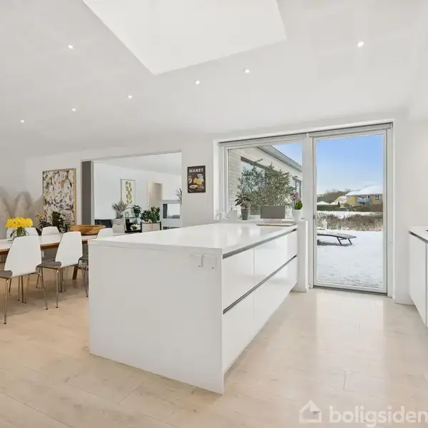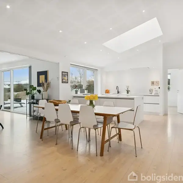 På en rolig, lukket villavej i det attraktive Roskilde vest finder I dette eksklusive étplanshus fra 2022, smukt placeret direkte op til fredede, grønne arealer. Her bor I i helt rolige omgivelser med naturen som nærmeste nabo, samtidig med at hverdagens bekvemmeligheder og Roskildes byliv er inden for kort rækkevidde – en ideel ramme for den moderne børnefamilie. Boligen byder jer velkommen i en rummelig entré med direkte adgang til et funktionelt bryggers med vaskefaciliteter og god opbevaringsplads, som gør hverdagen både praktisk og overskuelig. Herfra træder I videre ind i husets store og lyse køkken-alrum, der udgør hjemmets naturlige samlingspunkt. Det elegante køkken, de akustikregulerende lofter og de markante vinduespartier skaber en rolig og behagelig atmosfære, hvor lys og udsigt til de grønne omgivelser er en integreret del af oplevelsen. I åben forbindelse ligger opholdsstuen, som giver rig plads til både afslapning og samvær. Fra opholdsstuen har I direkte adgang til en skøn og ugeneret forældreafdeling med soveværelse, walk-in-closet og eget badeværelse. I husets anden ende ligger børneafdelingen med to gode værelser og eget badeværelse, hvilket giver børnene deres eget trygge og funktionelle område med plads til både leg, lektier og privatliv. Huset rummer derudover et ekstra soveværelse, med adgang fra entreen, samt det store kontor som tilbyder en ekstra fleksibilitet. Her kan I nemt etablere et femte soveværelse, et hjemmekontor, en hjemmefitness eller et kreativt hobbyrum – alt efter familiens behov. Ude venter en stor terrasse og en grøn have, der smelter sammen med de omkringliggende fredede arealer og skaber en helt særlig oplevelse af rum, luft og natur lige uden for døren. Her får I et gennemført, nyt hjem med en gennemtænkt planløsning, hvor forældre- og børneafdeling er naturligt adskilt, og hvor kvalitet, beliggenhed og moderne komfort går op i en højere enhed.