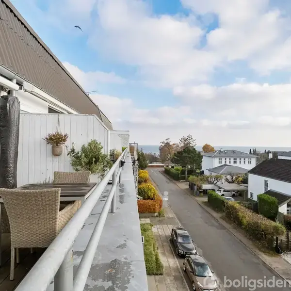 Åbent hus med tilmeldingskrav 1/2 - klik på billede - På Marievej 8A finder du en af Vedbæks sjældent udbudte lejligheder – placeret øverst i ejendommen, fordelt på to plan og med stor tagterrasse og udsigt til Øresund. Her får du en bolig, hvor klassisk stil møder moderne komfort, i rolige omgivelser blot få minutters gang fra havnen, stranden og stationen. Lejligheden byder på et smukt, sammenhængende opholdsrum med spisestue og køkken i åben forbindelse. De lyse fronter, integrerede hårde hvidevarer og god bordplads gør køkkenet både funktionelt og indbydende. Spisestuen vender mod syd og får et behageligt lysindfald gennem dagen, mens udsigten over trætoppene og hustagene skaber en luftig og fredfyldt stemning. De elegante sildebensgulve binder rummet smukt sammen og understreger boligens gennemførte stil. Master bedroom vender ligeledes mod syd og fremstår lyst og rummeligt med god plads til både seng og opbevaring. Dertil et ekstra værelse, der egner sig perfekt som gæsteværelse, kontor eller børneværelse. Badeværelset er lyst og velindrettet med bruseniche, gulvvarme og forsænket loft med indbyggede spots – en moderne og indbydende detalje, der fuldender det stilrene udtryk. Fra spisestuen fører en elegant trappe op til lejlighedens øverste etage, hvor opholdsafdelingen ligger – et hyggeligt og stemningsfuldt rum med åben pejs og plads til sofa og afslapning. Herfra er der direkte udgang til den store, solrige tagterrasse med udsigt over hustagene, trætoppene og mod Øresund. En helt særlig kvalitet, som giver en fornemmelse af lys, luft og frihed, man sjældent finder i området. Lejligheden rummer desuden et praktisk bryggers med rigelig skabsplads og vaskemaskine – en funktionel detalje, som gør hverdagen endnu lettere. Ejerforeningen er yderst veldrevet og tilbyder både fællesvaskeri, cykelkælder og mulighed for at leje ekstra opbevaringsplads i fællesrum. Derudover medfølger eget kælderrum samt gode parkeringsforhold i gården bag ejendommen. Alt i alt en lys, elegant og veldisponeret lejlighed med eftertragtet beliggenhed og en tagterrasse, der skal opleves.