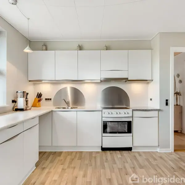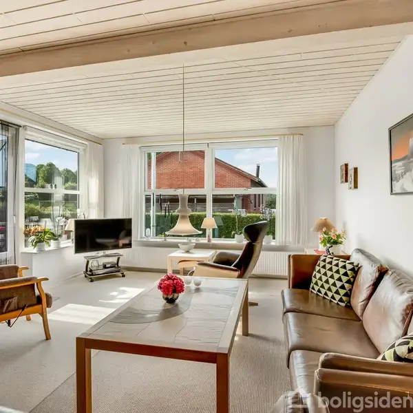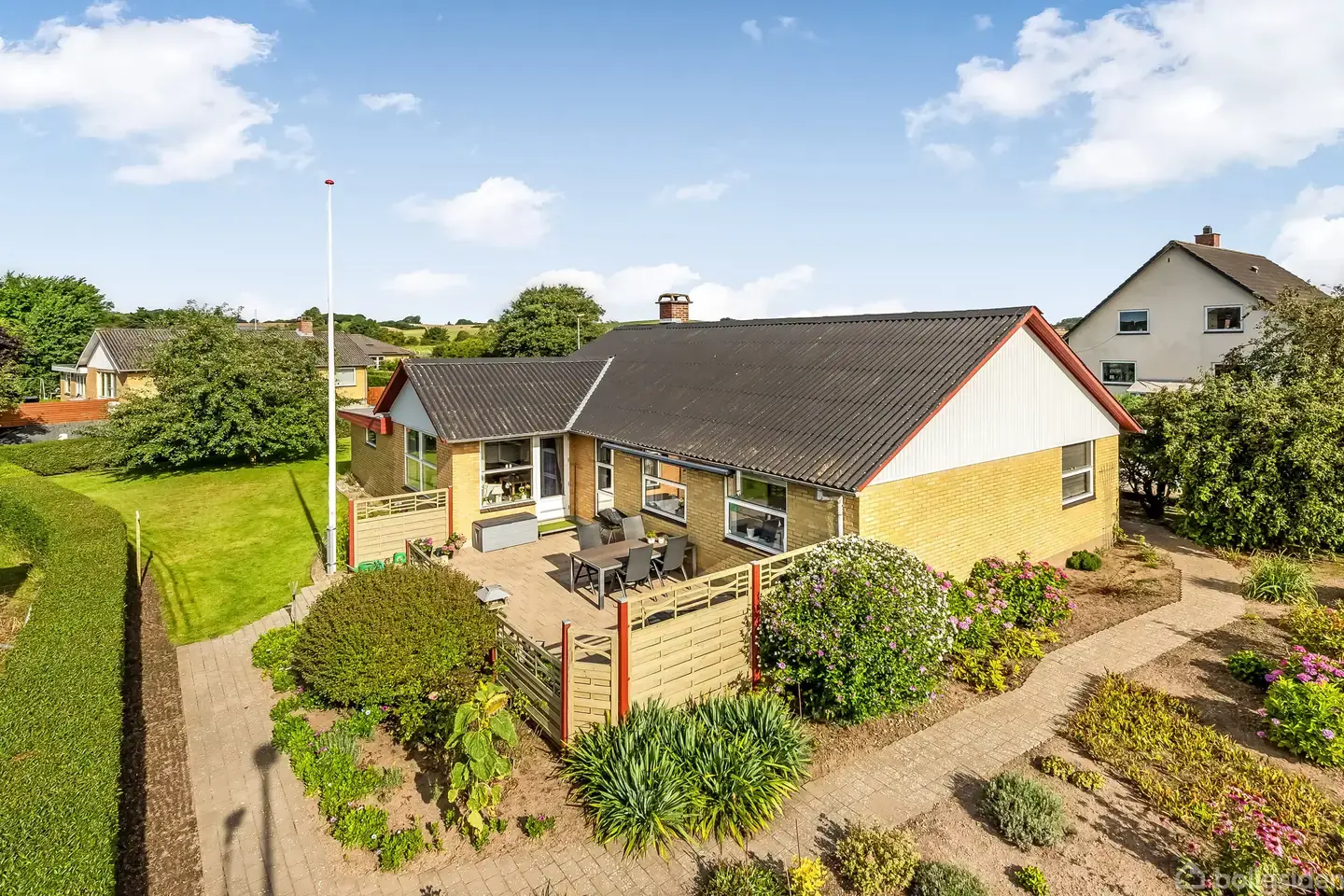 På Marstrup Kirkevej 86 i Hoptrup finder du denne indbydende etplansvilla, der kombinerer funktionalitet, lys og rummelighed med en skøn have og naturskønne omgivelser. Huset er opført med gule mursten, og fra den sydvendte terrasse er der udsigt til en smukt anlagt have med farverige bede, veltrimmede buske og god plads til udeliv. Her kan sommerdagene nydes i fredelige rammer.Indenfor mødes du af et lyst og velholdt hjem, hvor planløsningen er gennemtænkt for at skabe både privatliv og fælles
