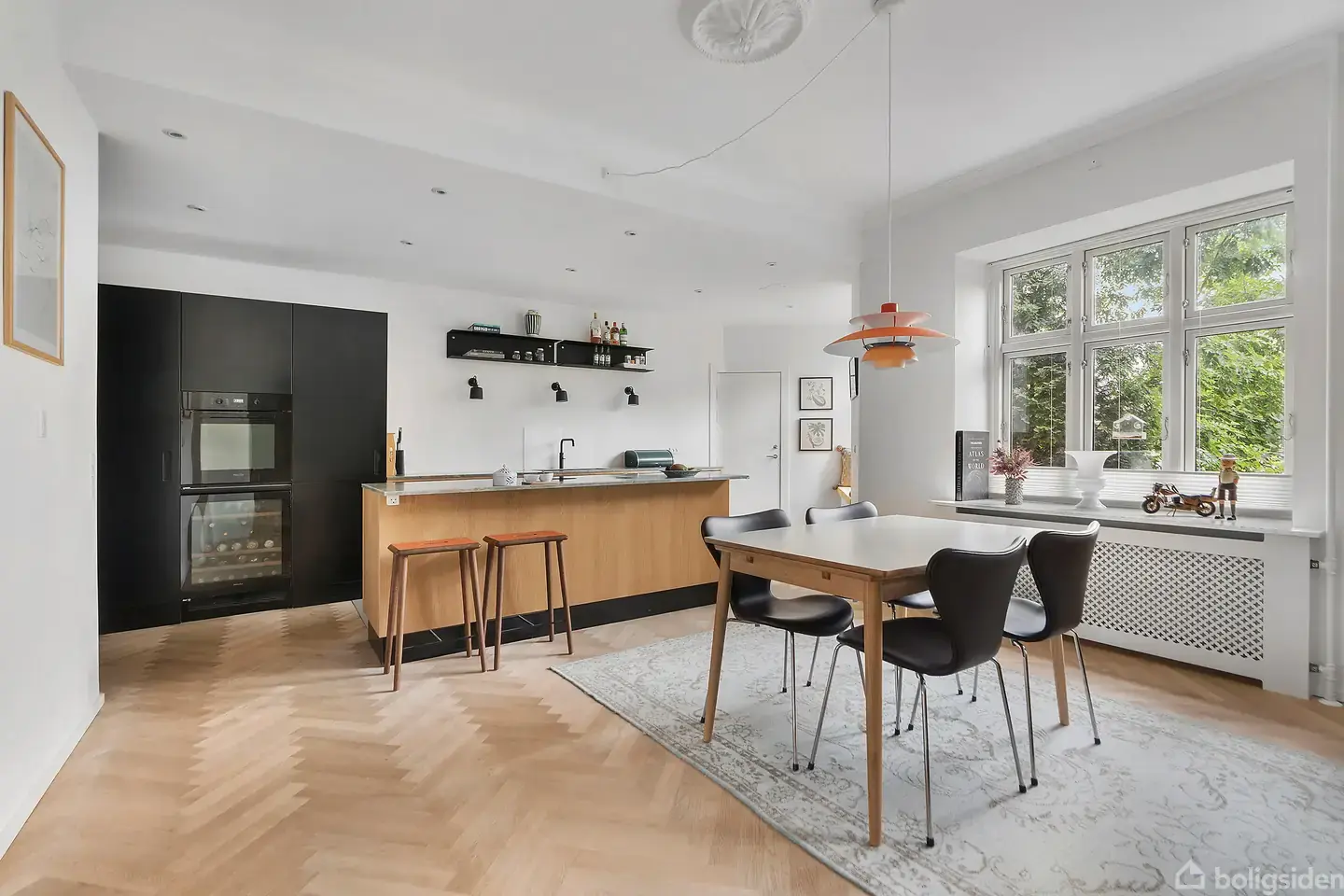 Lækker og højloftet stuelejlighed med fredelig fælleshave På Mathildevej, der er en af Frederiksbergs meget hyggelige, smukke og populære veje, finder I denne attraktive stuelejlighed i en facaderenoveret ejendom fra 1909, hvor I kommer til at bo tæt på de fantastiske grønne oaser Frederiksberg Have, Zoo og Søndermarken. Lejligheden er på 130 veldisponerede kvadratmeter, og de blev grundigt og særdeles smagfuldt renoveret i 2022, da to lejligheder blev fusioneret til denne dejlige og overraske