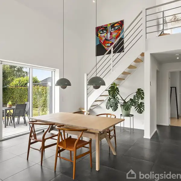 Drømmer I om en moderne, arkitekttegnet villa i et roligt, familievenligt område, hvor både natur og byliv er tæt på? Så er denne flotte familievilla fra 2011 i hjertet af Mejdal lige noget for jer. Ejendommen præsenterer sig smukt med sin hvide facade og sorte tag og byder på hele 166 velindrettede kvadratmeter fordelt på to etager. Stueplan imponerer med en lys og rummelig entré, hvor der er god plads til både sko, overtøj og hverdagens praktiske gøremål. Herfra føres I direkte ind i husets h
