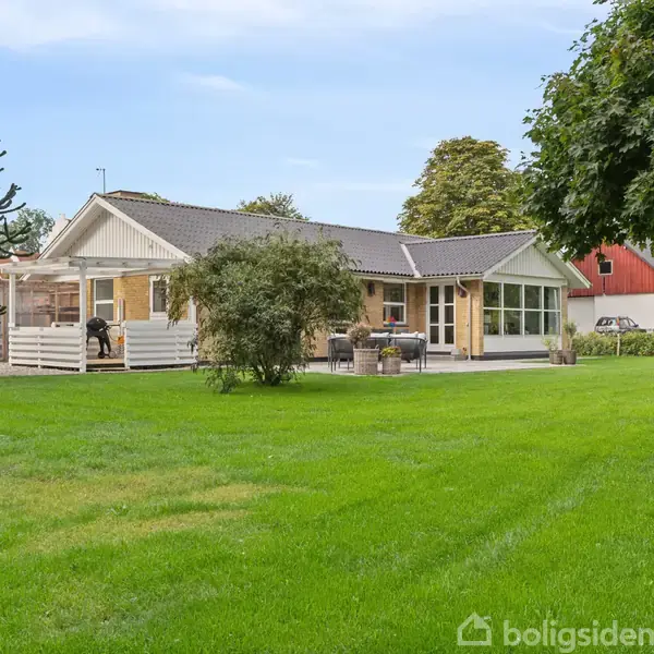 Charmerende villa på solrig 6.361 m2 grund med terrasse, lys og plads Denne charmerende villa ligger som et roligt fristed på en stor, solrig grund på 6.361 m2, og byder på en varm og indbydende stemning allerede ved ankomst.Boligen på 124 m2 rummer stort soveværelse og yderligere 2 værelser og en planløsning, der inviterer til både hverdagens rolige rutiner og hyggelige samlinger med familie og venner. Her mærker man straks potentialet til at skabe et hjem med sjæl, hvor ude- og inderum smelte
