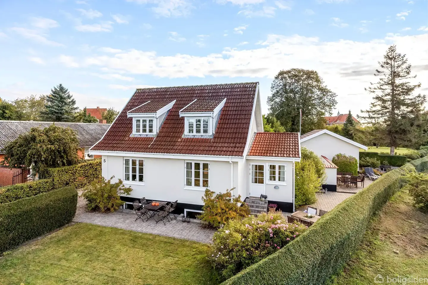 Velkommen til Møllegårdsalle 5. Vi glæder os til at byde dig indenfor. På Møllegårdsalle 5 får du en velholdt 1,5-plans villa med bl.a. 3 gode værelser og et rummeligt samlingsrum. Ejendommen byder på en mulighedsrig grund på hele 1.826 m2. Denne adresse giver dig en bynær placering, så du befinder dig nær alle hverdagens fornødenheder. Selve boligen er indrettet som følger: Fra entréen bydes du velkommen til en fin og praktisk indgang, der ligeledes agerer fordelingsgang til hhv. boligens førstesal og kælder. Herfra træder du ind i et funktionelt og åbent køkkenalrum. Køkkenet indeholder dets nødvendigheder og rummer bl.a. god skabsplads og lyse overflader, hvilket automatisk lysner rummet op. Med et super lysindfald får du et skønt køkkenalrum, hvor madlavning og samvær kan foregå samtidig uden man føler sig isoleret. Køkkenalrummet giver dig direkte adgang til boligens stue, som byder på et rummeligt samlingsrum med plads til både spiseplads- og sofaområde. Opholdsrummet er perfekt til at tilbringe hyggelige stunder og nærvær med familien. I stueplan finder du ydermere et fint badeværelse, der rummer vask med skabsplads, toilet og brus. Det disponible rum, der fører dig fra stue til badeværelse, har attraktiv terrassedør, så inde- og udemiljøet let kan forbindes til én samlet helhed. Den flisebelagte terrasse skaber netop et udendørs opholdsområde, som giver mulighed for ren afslapning, imens du kan nyde solens stråler. Terrassen er desuden aflukket, så du kan opholde dig privat og ugenert. Førstesalen byder på 3 værelser, der alle har en god og anvendelig størrelse. To af værelserne har kviste, hvilket særligt øger lysindfaldet og de skaber ligeledes en god rumfornemmelse. Boligens kælder på 56 m2 bidrager med to disponible rum, som du med fordel kan anvende til opbevaring mv. Derudover finder du ligeledes et praktisk bryggers med plads til hverdagens huslige opgaver. På ejendommen finder du en garage på 49 m2, der er fuld af muligheder. Garagens placering medvirker til at skabe et hyggeligt lukket gårdmiljø, der ligeledes har flisebelagt terrasse med gode opholdsområder. Denne bynære placering giver dig kort afstand til alle hverdagens nødvendigheder – herunder indkøbsmuligheder, skole, institutioner samt sportsfaciliteter. Derudover finder du Nyled Station blot få hundrede meter væk. Selvom du befinder dig centralt i byen, så byder det nærliggende område på skønne naturoplevelser med både Grønnehaveskoven og Nykøbing Sj. lystbådehavn lige i nærheden. Lyder ovenstående interessant? Kontakt os allerede i dag på 59 91 33 33 for en fremvisning.