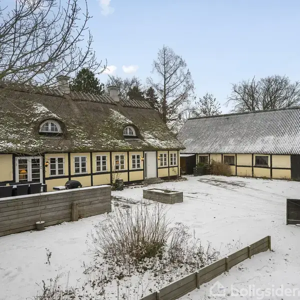 Ejendommen: Denne idylliske bindingsværksejendom fra 1877 emmer af charme, historie og landlig ro. Med sit klassiske stråtag og smukke proportioner fremstår ejendommen fin og i god stand. Boligen er opført i 1,5 plan og rummer hele 237 bolig kvm, suppleret med en længe på 250 kvm, der giver rig mulighed for hobby, værksted, opbevaring eller dyrehold – alt efter behov og drømme. Ejendommen er beliggende på en stor grund på 3.030 kvm, hvor haven folder sig ud med gamle træer, grønne kig og skønne
