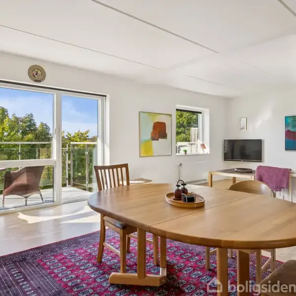 I træder ind i et lyst hjem på øverste etage, hvor elevator fører jer direkte op til døren. Lejligheden ligger roligt placeret i Midtbyen, men giver stadig nem adgang til byens tilbud, og førsteindtrykket er et indbydende, overskueligt plan med kig ud over grønne arealer og tage.  Planløsningen rummer et stort åbent køkken-alrum og stue i ét, hvor brede vinduer lukker dagslyset ind og skaber sammenhæng mellem madlavning, spisning og ophold. Køkkenet er funktionelt med hvide elementer og arbejds