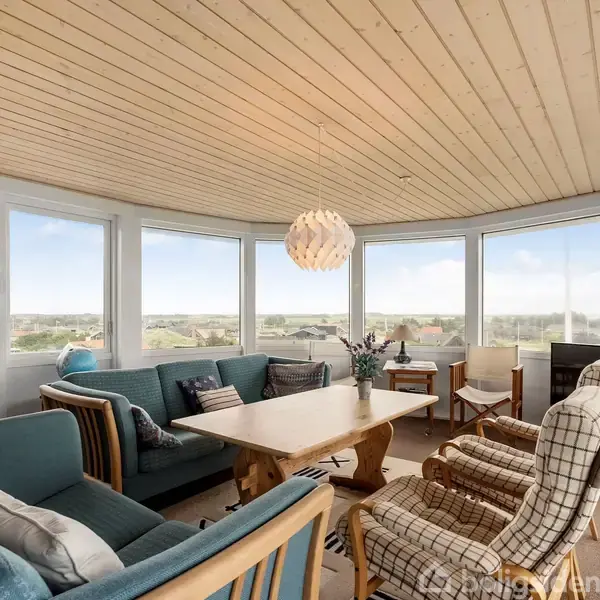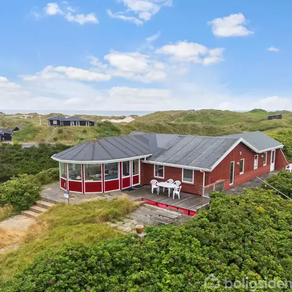 Molsvej 22 i Søndervig er et sjældent udbudt sommerhus – højt placeret i landskabet med en spektakulær panoramaudsigt over både Ringkøbing Fjord, det rå klitlandskab og det imponerende Vesterhav. Her får du ikke bare et sommerhus, men en unik beliggenhed, hvor naturens skiftende udtryk bliver en del af din hverdag. Hovedhuset er opført i gasbeton, men er ekstra isoleret og beklædt med træ lige som resten af huset. Sommerhuset rummer en gennemtænkt planløsning, der gør det oplagt til både familieliv og afslapning. Du bydes velkommen i en rummelig entré med god plads til sko og overtøj. Herfra fører en fordelingsgang dig videre til et badeværelse og et seperat toilet med gulvvarme i begge rum og det lyse, funktionelle køkken. Fra køkkenet er der adgang til husets tre værelser via endnu en fordelingsgang – praktisk og velegnet til både børnefamilier og gæster. Spise- og opholdsstuen udgør boligens naturlige samlingspunkt og er opdelt i to afdelinger, begge med god plads til hygge og samvær. De store vinduespartier i opholdsstuen giver et fantastisk lysindfald og en udsigt, der ganske enkelt skal opleves – her ser du både fjorden i det fjerne og havets horisont i vest. Udendørs kan du nyde livet på den store terrasse, som strækker sig fra øst til vest. Her kan du følge solen hele dagen, mens du nyder udsigten over det bølgende landskab og mærker havbrisen. Til sommerhuset er der en dobbeltgarage og et redskabstum. I henhold til kommuneplanen er det muligt at bygge op til 180 kvm. Sommerhuset er ikke tilmeldt udlejning. Beliggenheden i Søndervig er i særklasse: Kun få hundrede meter fra stranden og med restauranter, dagligvarebutikker og shopping muligheder lige i nærheden. Molsvej 22 er til dig, der ønsker et sommerhus med en enestående placering og en udsigt, der tager pusten fra de fleste.