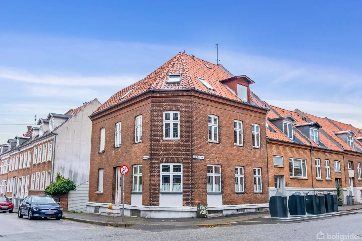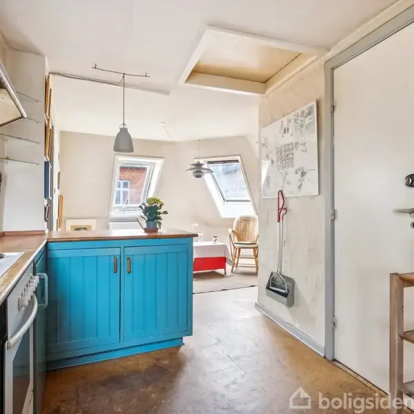 Øverst i en klassisk rødstensejendom fra slutningen af 1800-tallet gemmer der sig en lejlighed, du sjældent finder magen til på Frederiksbjerg.Ikke fordi den er gennemrenoveret – tværtimod. Den står stort set, som den blev bygget, og netop derfor er den noget helt særligt. Her får du et hjem, der både oser af charme og rummer et potentiale, der sjældent udbydes i området.Det officielle boligareal lyder på 59 m², men taglejlighedens skråvægge betyder, at de mange ekstra kvadratmeter under skunken
