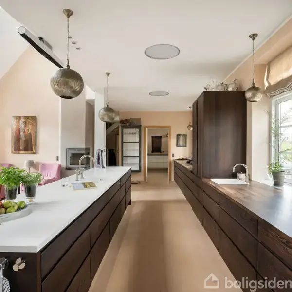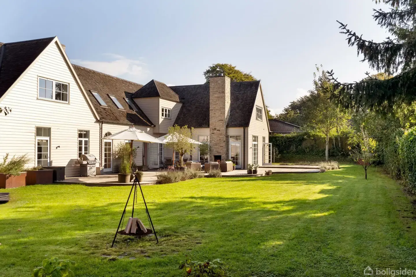 På en lukket og rolig vej i Hvalsø ligger denne eksklusive New England-inspirerede liebhavervilla, opført i 2009. Her forenes klassisk arkitektonisk ro med moderne komfort, gennemtænkte løsninger og en usædvanlig smuk sammenhæng mellem hus, have og omgivelser. Villaen fremstår helstøbt og konsekvent udført med fokus på lys, proportioner og materialer i absolut højeste kvalitet. Kombinationen af holdbare, ædle materialer og moderne byggeteknik sikrer meget lave forbrugsudgifter, hvor energieffektivitet, funktionalitet og lang levetid går hånd i hånd – en sjælden kvalitet i denne klasse af ejendomme. Facaderne er træbeklædt med mahogni malet i en farve, som tilfører huset varme, karakter og et tidløst, eksklusivt udtryk. Taget er udført i Canadian Red Cedartræs-shingles, der patinerer smukt over tid og understreger husets arkitektoniske lethed og klassiske New England-style. Allerede ved ankomsten fornemmes husets diskrete luksus. Indgangen er elegant og indbydende, og indenfor åbner rummene sig med luft, højde og en naturlig sammenhæng, der gør boligen både harmonisk og intuitiv at leve i. Den integrerede garage er smukt indpasset i arkitekturen og har direkte adgang til boligen – en praktisk og komfortabel løsning i hverdagen. Opholdsrummene danner hjemmets naturlige samlingspunkt. Stue og spisestue flyder roligt sammen, badet i gennemgående dagslys, der giver rummene en let og afslappet atmosfære. I direkte forbindelse med stuen findes et værelse/kontor – ideelt som hjemmearbejdsplads, gæsteværelse eller multirum – med direkte udgang til terrassen og en smuk forbindelse mellem inde og ude. Materialevalget er kompromisløst og gennemført. 22 mm massive Aniegré-gulve, fine snedkerdetaljer, facadens træbeklædning og udvalgte kobberelementer vidner om kvalitet på øverste hylde. Samtidig er boligen indrettet med en teknisk og konstruktiv kvalitet, der gør den usædvanligt billig i daglig drift. På 1. sal findes i alt fem soveværelser, herunder master med eget badeværelse, og i stueetagen findes yderligere to værelser, hvoraf det ene har direkte udgang til terrassen. Boligens nedre plan inviterer til afslapning og samvær. Store glaspartier forbinder huset med den markante træterrasse på ca. 200 m², hvor livet leves i forlængelse af boligen – fra stille morgener til lange sommeraftener ved den udendørs pejs. Beliggenheden fuldender helheden. Mod øst åbner smukke grønne områder sig og giver fornemmelsen af luft, natur og åbenhed i hverdagen. Samtidig er der kort afstand til skoler, institutioner og Hvalsøs gode indkøbsmuligheder. København nås på blot 30–40 minutter med tog eller bil. Som en sjælden og attraktiv mulighed kan nabogrunden på 893 m² erhverves, hvilket åbner for mange perspektiver – eksempelvis etablering af tennisbane, boldbane eller opførelse af en ekstra boligenhed til flere generationer. Et hjem for den kvalitetsbevidste køber, der søger arkitektonisk tyngde, ro og æstetik – kombineret med meget lave ejerudgifter, høj funktionalitet og en beliggenhed, der favner både natur, fællesskab og byliv.
