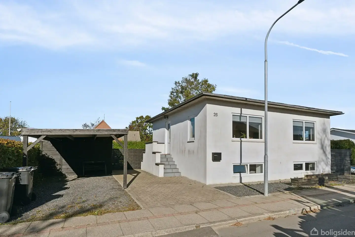 Hyggeligt, vinkelbygget 2 plans pudset hus, opført i 1950, tilbygget i 2012 og løbende moderniseret. Boligareal 108 kvm. + 56 kvm. kælder. Desuden 34 kvm. carport og 16 kvm. udhus. Beliggende i lukket have med stor terrasse. Indretning: Vindfang med klinkegulv, entre med nedgang til kælderen, pænt hvidt køkken, badeværelse med bruseniche, skabsmiljø og gulvvarme, dejlig stue, fordelingsgang, værelse, 3 trin ned: gang, soveværelse medc skabe og børneværelse med skabe og udgang til skøn terrasse. Kælderen: Gang, stort vaskerum med bord, skabe, vaskemaskine, tørretumbler, badeværelse med bruseniche, 2 gode disponible rum.Kontakt Ejendomsmægler Helge Smidt for fremvisning.