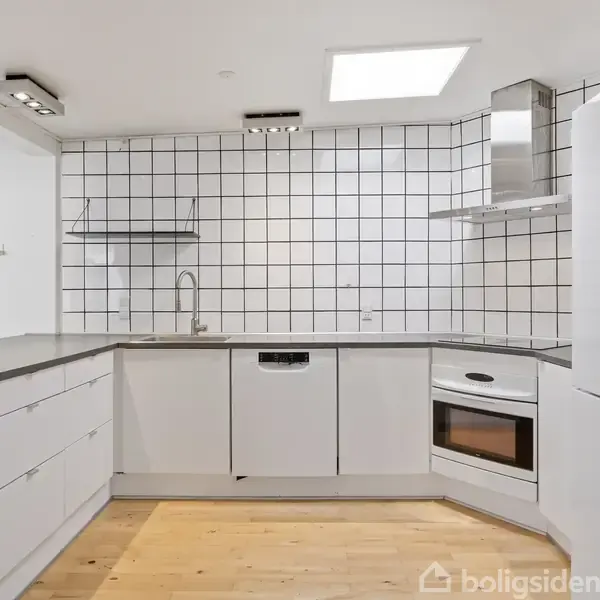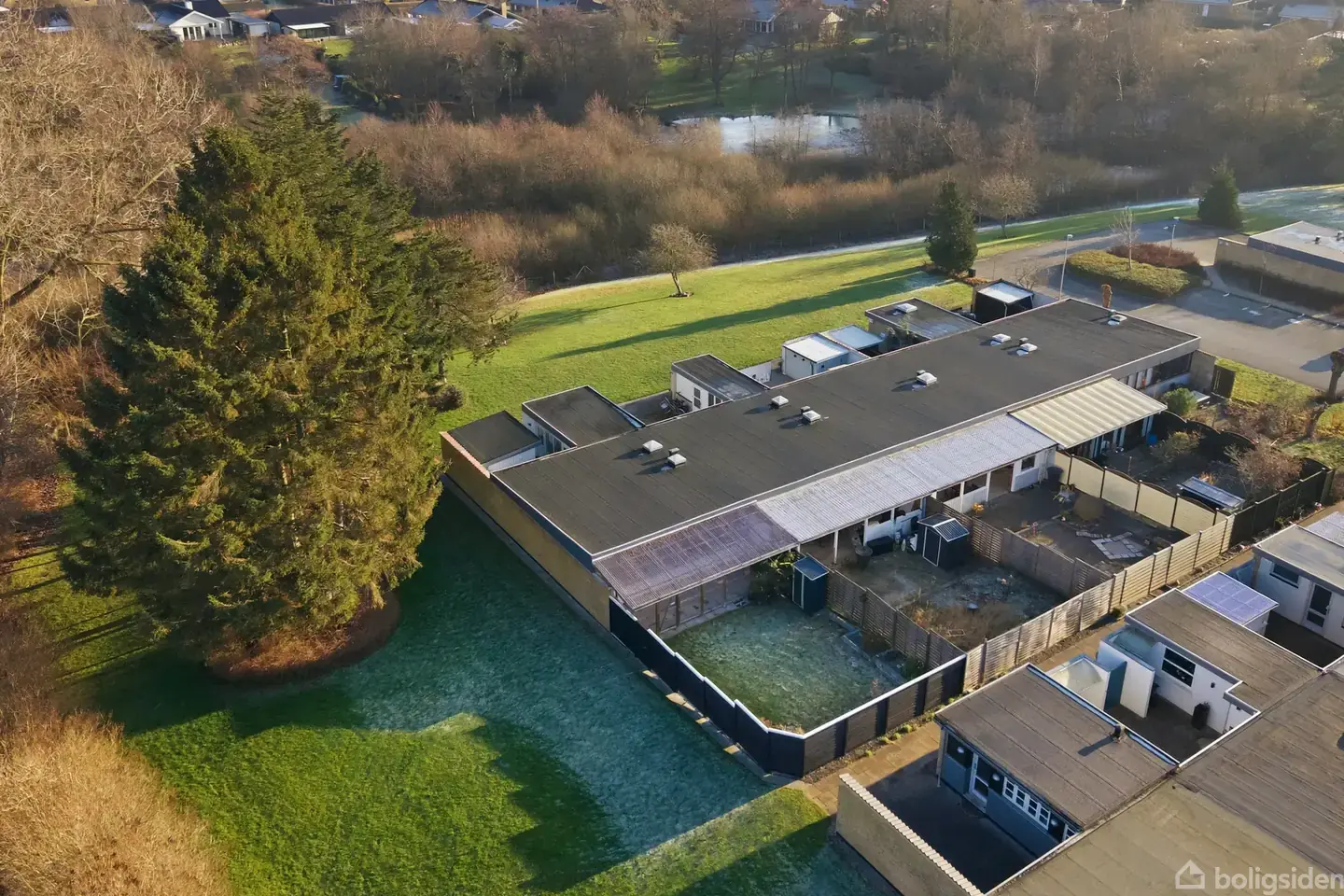 Rækkehuset er opført i 1966 og rummer 100 m² med en funktionel planløsning og direkte adgang til grønne områder. Boligen består af fire rum, heraf tre soveværelser samt en stue med store vinduespartier og udgang til haven. Grunden er på 230 m² og giver en naturlig sammenhæng mellem bolig og udearealer.Køkkenet er lyst og praktisk indrettet med hvide fliser, god skabsplads og plads til spisebord. Stuen har direkte forbindelse til terrasse og have via store dørpartier, som giver mulighed for at åb
