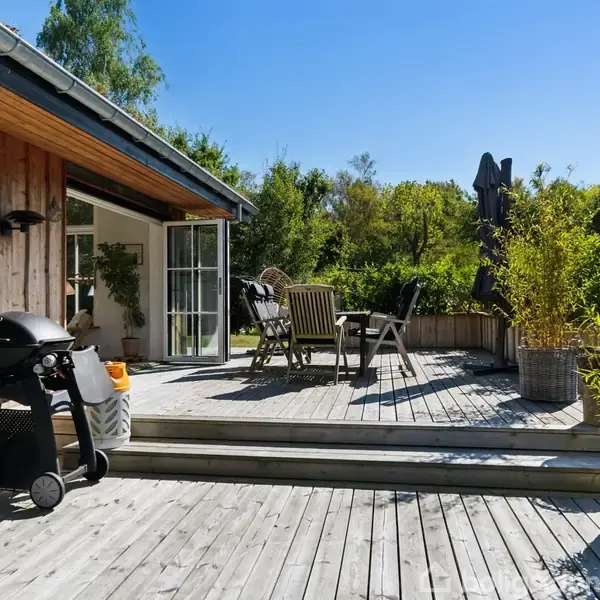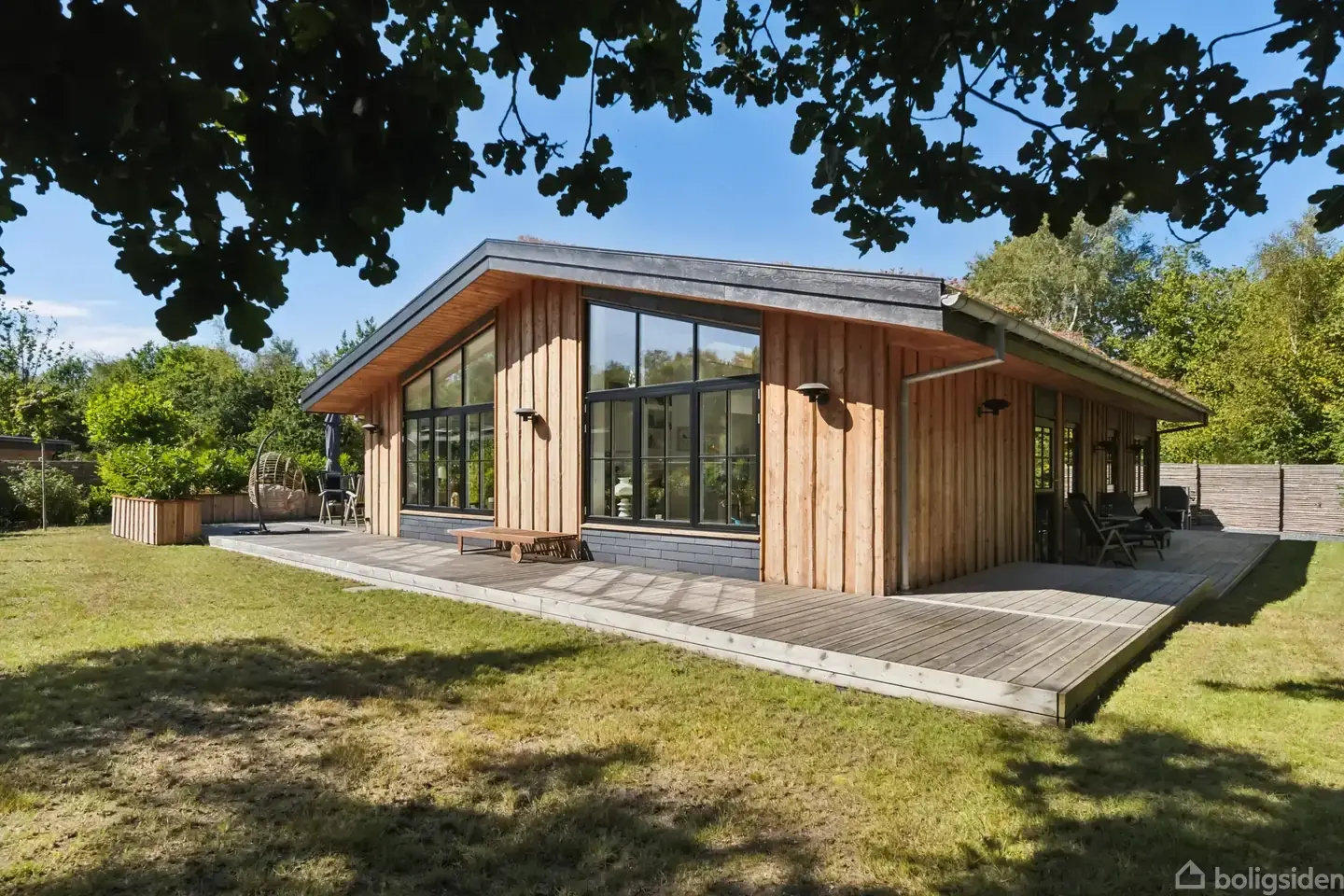 VELKOMMEN PÅ NATSVÆRMERVEJ 5Huset er opført i 2021 og fremstår moderne, lyst og imødekommende – med loft til kip i opholdsrummene, naturlige materialer og en lækkert udført træterrasse, der smyger sig rundt om huset og gør udelivet til en naturlig del af hverdagen. Den gennemtænkte materialepalet med træfacade og naturtag understøtter det enkle, arkitektoniske udtryk og falder smukt ind i de grønne omgivelser. Indenfor får du 130 m² veldisponeret bolig med lyse opholdsrum og en planløsning, der