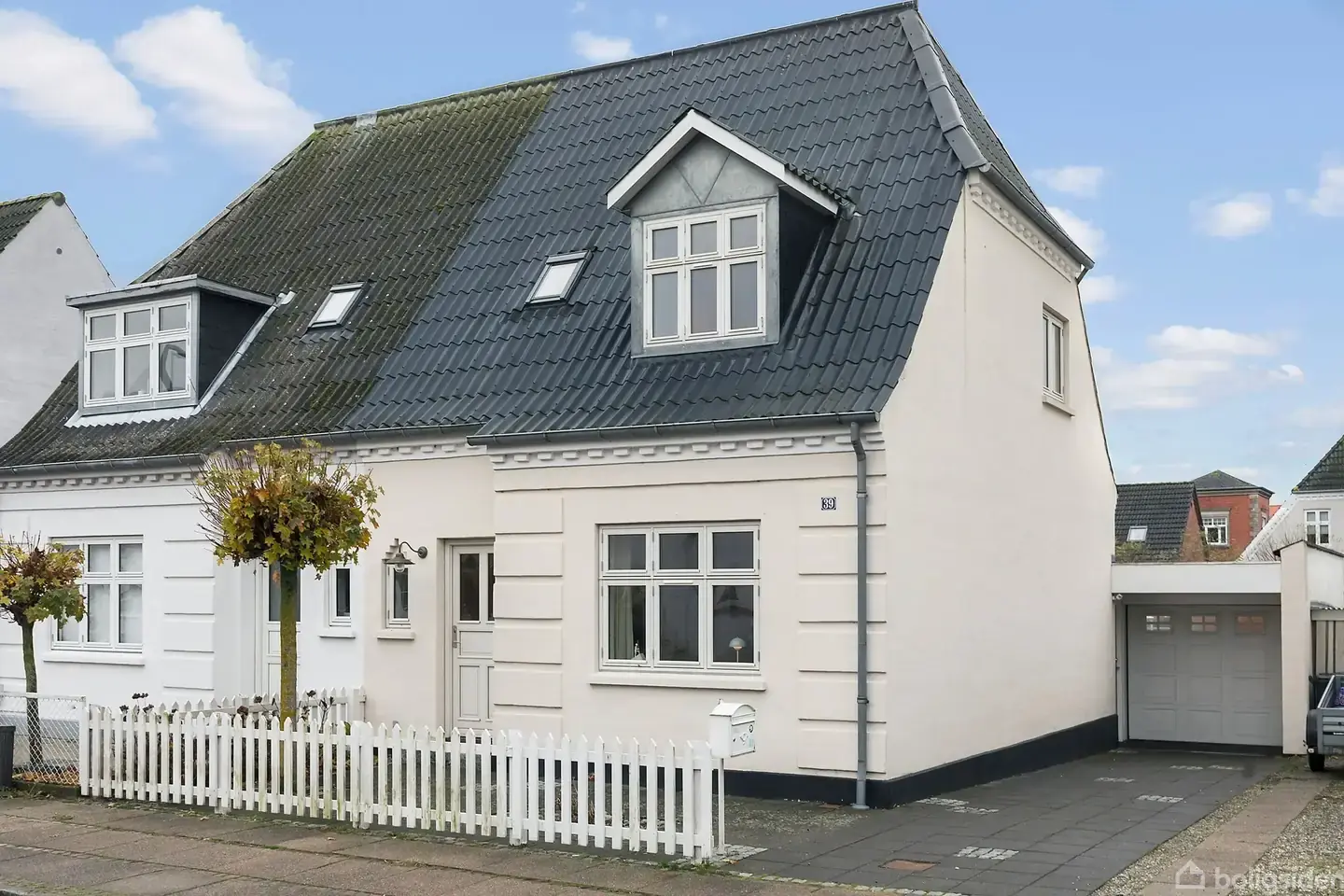 Der er nogle adresser i Nykøbing, som bare føles helt rigtige – og Neergaardsvej 39 er én af dem. Her får I et romantisk og utrolig velholdt sammenbygget dobbelthus, hvor hverdagen leves midt mellem byens liv og den rolige stemning i det eftertragtede “sygehuskvarter” på Nørrebro. Det hvide stakit, de klassiske proportioner og den smukke facade byder jer velkommen allerede på fortovet, og indenfor fortsætter den varme atmosfære. Lys, let og indbydende – 89 m² med charme Boligen rummer 89 m², der er disponeret, så de både føles overskuelige og overraskende rummelige. Overalt mødes I af lyse vægge, smukke plankegulve og små detaljer, der giver huset personlighed. Opvarmningen sker med fjernvarme, så I får en bekvem og økonomisk venlig løsning, der passer til det moderne byhusliv. I træder ind i en dejlig entré med flotte fliser og den klassiske trappe, hvor det blå gelænder giver et charmerende strejf af farve – som et nik til husets sjæl og historie. Her er plads til hverdagens jakker og sko, og I har adgang til et praktisk lille gæste-WC, lige dér hvor man har brug for det. Videre ind åbner huset sig op i en skøn, sammenhængende stue, hvor lys strømmer ind fra begge ender. Her er rigelig plads til både blød sofa, legetøj på gulvet og en stor spiseafdeling, hvor venner og familie kan samles til lange middage. Det er et af de rum, hvor man næsten automatisk får lyst til at sætte sig ned, tænde en lampe og bare være. I direkte forbindelse ligger det pæne, nyere køkken, som på én gang er funktionelt og hyggeligt. De beige fronter, de varme træbordplader og de moderne hårde hvidevarer giver det helt rigtige mix af klassisk udtryk og nutidig komfort. Her kan I brygge morgenkaffe, mens I kigger ud mod haven. 1. sal med soveafdeling og badeværelse På 1. sal får I husets rolige afdeling. Her finder I et lyst og behageligt soveværelse, hvor der er plads til dobbeltseng, skabe og måske en lille læsekrog ved vinduet. Det ekstra værelse fungerer perfekt som børneværelse, kontor eller kombinationen af begge – et fleksibelt rum, der kan følge jer gennem forskellige livsfaser. Badeværelset på 1. sal har bruseniche og vask med skabsplads. De lyseblå fliser giver rummet en fin, nostalgisk stemning, som får én til at tænke på klassiske bylejligheder – bare i en opdateret og funktionel version. Ovenlysvinduet lukker dagens første lysstråler ind, så I kan starte dagen i et lyst rum. Gårdmiljø, overdækket terrasse og ekstra bonus-kvadratmeter Bag huset folder et lille univers sig ud, som I med garanti vil komme til at bruge flittigt. Den lukkede gårdhave er anlagt med fliser, så I slipper for det store havearbejde, men får et privat uderum til sommerfrokoster, børneleg, krukker og lyskæder. Fra indkørslen er der en garage (reg. som carport på bbr) – med port og plads til både cykler og hverdagens “skal bare lige sættes her”-ting. I forlængelse heraf finder I en overdækket terrasse, som nærmest fungerer som en ekstra stue i de milde måneder I gården ligger desuden et udhus på 26 m², der er indrettet så gennemtænkt, at det føles som et lille ekstra hus: Et virkelig lækkert bryggers/vaskerum med god bord- og skabspladsEt praktisk redskabsrum til alt det, der ikke skal med ind i husetDisse kvadratmeter indgår ikke i boligarealet på BBR, men i dagligdagen vil I opleve dem som en kæmpe luksus – her er plads til vasketøj, opbevaring, barnevogn, værktøj og alt det, der giver ro og orden i selve boligen. Beliggenhed man forelsker sig i Neergaardsvej 39 ligger midt i det stemningsfulde sygehuskvarter på Nørrebro, hvor de klassiske byhuse, de små forhaver og de rolige gader skaber en helt særlig atmosfære. Her hilser man på naboerne, børn cykler på vejen, og alligevel har I kun få minutters gang til centrum af Nykøbing med butikker, caféer, kulturliv og havnen. Kort fortalt: Her får I et romantisk og velholdt sammenbygget dobbelthus, hvor alt går op i en højere enhed – god planløsning, flotte materialer, fjernvarme, lækre udhuse, privat gårdhave, garage og en beliggenhed, der gør hverdagen både nem, smuk og levende.
