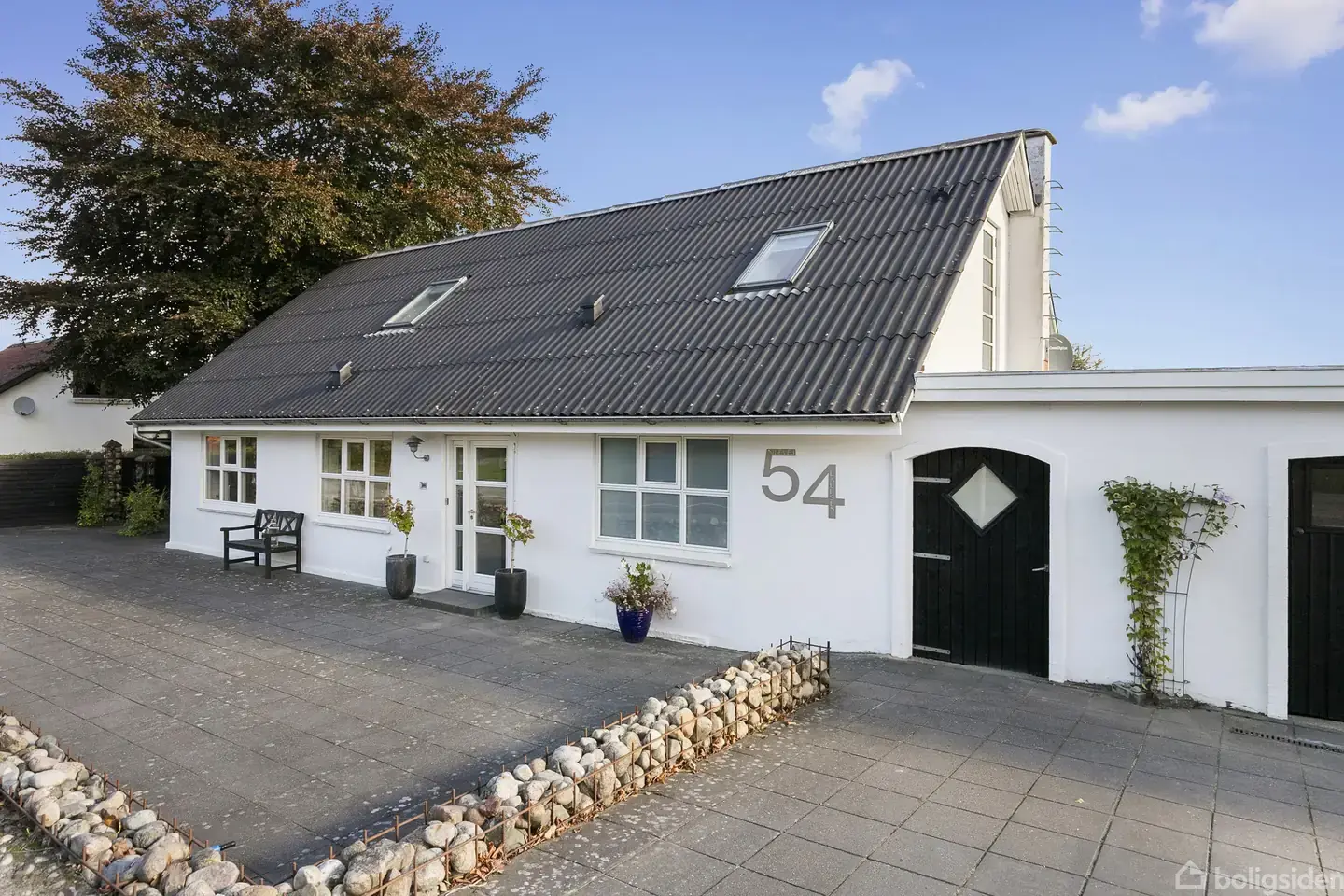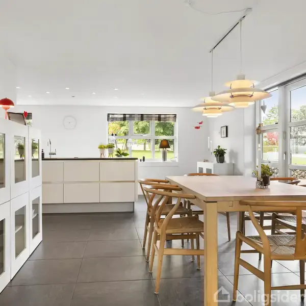 Nibevej 54 i Sørup er huset, der tager imod dig med hvid facade, sort tag og et roligt, tidløst udtryk. Man mærker hurtigt, at her er tænkt over både hverdag og atmosfære: boligen rummer i alt 214 m² fordelt på 155 m² i stueplan og 59 m² på første sal, og den står indflytningsklar efter en gennemgribende renovering i 2010, hvor også tag og vinduer er skiftet, samt ny udvendig maling i 2024. Den 48 m² store, integrerede garage er forbundet direkte til huset, så du går tørskoet mellem bil og bolig