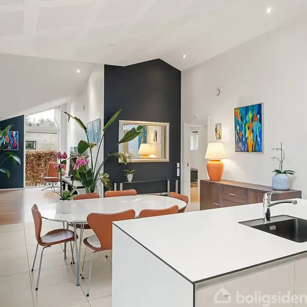 Niverød Bakke 44 – moderne indflytningsklar villa fra 2016Du møder en moderne og velindrettet villa fra 2016 med energimærke A2010, gennemført planløsning og skønne udearealer i et roligt og eftertragtet kvarter. Murstensfacader, flot tegltag og en bred, præsentabel indkørsel giver en ordentlig og imødekommende ankomst.Indenfor træder du ind i en indbydende entré med adgang til et praktisk bryggers og videre til hjemmets centrale opholdsrum. Planløsningen er gennemtænkt med fire gode værelser og