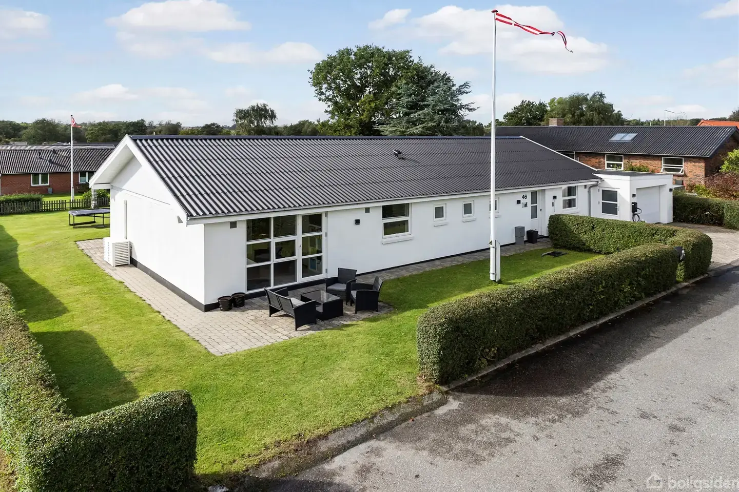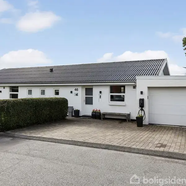 Nøddevej 46, Skive – Fantastisk familievilla med dejlig luft omkring boligen. Velkommen til denne skønne og særdeles velholdte villa, højt beliggende på Nøddevej 46 i et attraktivt og roligt kvarter med stisystemer direkte til skole, indkøb og fritidsaktiviteter – og kun få hundrede meter fra Skive Golfbane. Grunden er på hele 936 m² og fremstår særdeles velanlagt med opvokset beplantning i skel og en ugenert baghave. Her skråner grunden smukt ned mod et fladt plateau, der indbyder til leg og ophold. Villaen byder på en delvis afskærmet sydvestvendt terrasse, et hyggeligt havehus samt en flot flisebelagt indkørsel med god plads til parkering og direkte adgang til garage. Størstedelen af haven er anlagt med plæne – nem at holde og perfekt til børnefamilien. Boligen er opført i 1984 i rødbrune sten og ombygget i 1989. I 2005 fik villaen en flot hvidpudset facade, og taget er i nyere sort eternit uden asbest fra 2024! Herudover er der tilhørende isoleret garage fra 2011, med integreret hobbyrum på hele 54 m². Garagen er velegnet til såvel bil, børnefødselsdag eller teenagerfest. Ejendommen fremstår særdeles velisoleret og velholdt – her er bl.a. monteret nyt fjernvarmeanlæg. Indretning: – Lys entré/bryggers med god opbevaringsplads – Stort og indbydende hjerterum med flot, hvidt U-formet køkken fra 2007 i delvis åben forbindelse med spiseafdeling – Stor og lys stue med hyggelig brændeovn fra 2014, flot granitstensvæg og udgang til den sydvestvendte terrasse – Rummeligt soveværelse med adgang til lækkert, renoveret badeværelse med bruseniche fra 2007. – der er ligeledes adgang til badeværelse via lille mellemgang. – Tre ekstra værelser – oplagt til børn, kontor eller hobby Alt i alt en villa med en optimal planløsning og masser af plads til familien – både ude og inde. Kort fortalt: En fantastisk familievilla på Nøddevej 46 med skøn beliggenhed, dejligt view over boligerne mod baghaven og masser af plads – absolut et besøg værd!