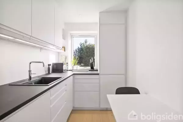 Flot 2 værelses ejerlejlighed i det eftertragtede Syvmøllergården i Køge. Lejligheden er elegant og gennemført med et fantastisk udtryk, der særligt kommer til sin ret i den åbne forbindelse mellem køkken og stue. De gennemgående gulve, der blev lagt i forbindelse med en større renovering i 2019, binder boligens rum sammen og understreger det stilrene look. Badeværelsets tidløse fliser tilføjer ligeledes en flot finish til helheden. Lejlighedens hjerte er kombinationen af stue og køkken, som ti