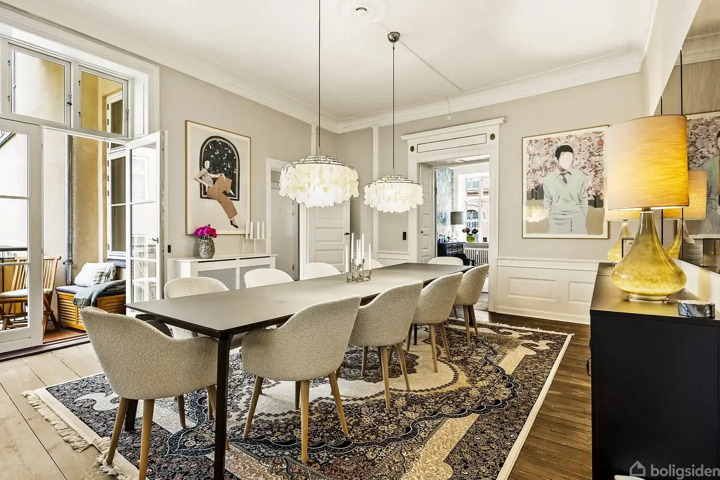 Midt på Nørregade, i en smuk og klassisk ejendom, finder du denne gennemførte herskabslejlighed på hele 236 m². Her forenes historisk arkitektur og moderne komfort i en bolig, hvor atmosfære, volumen og kvalitet er i centrum. Lejligheden imponerer med ca. 3,5 meter til loftet, smukke stuklofter, høje paneler og elegante proportioner, der skaber en helt særlig ro og tyngde. De store rum giver en fornemmelse af luft og plads, som sjældent findes – selv i dette område. Boligen byder på tre st