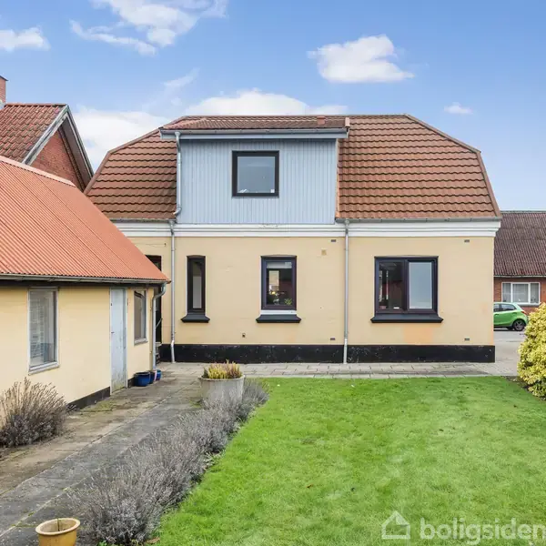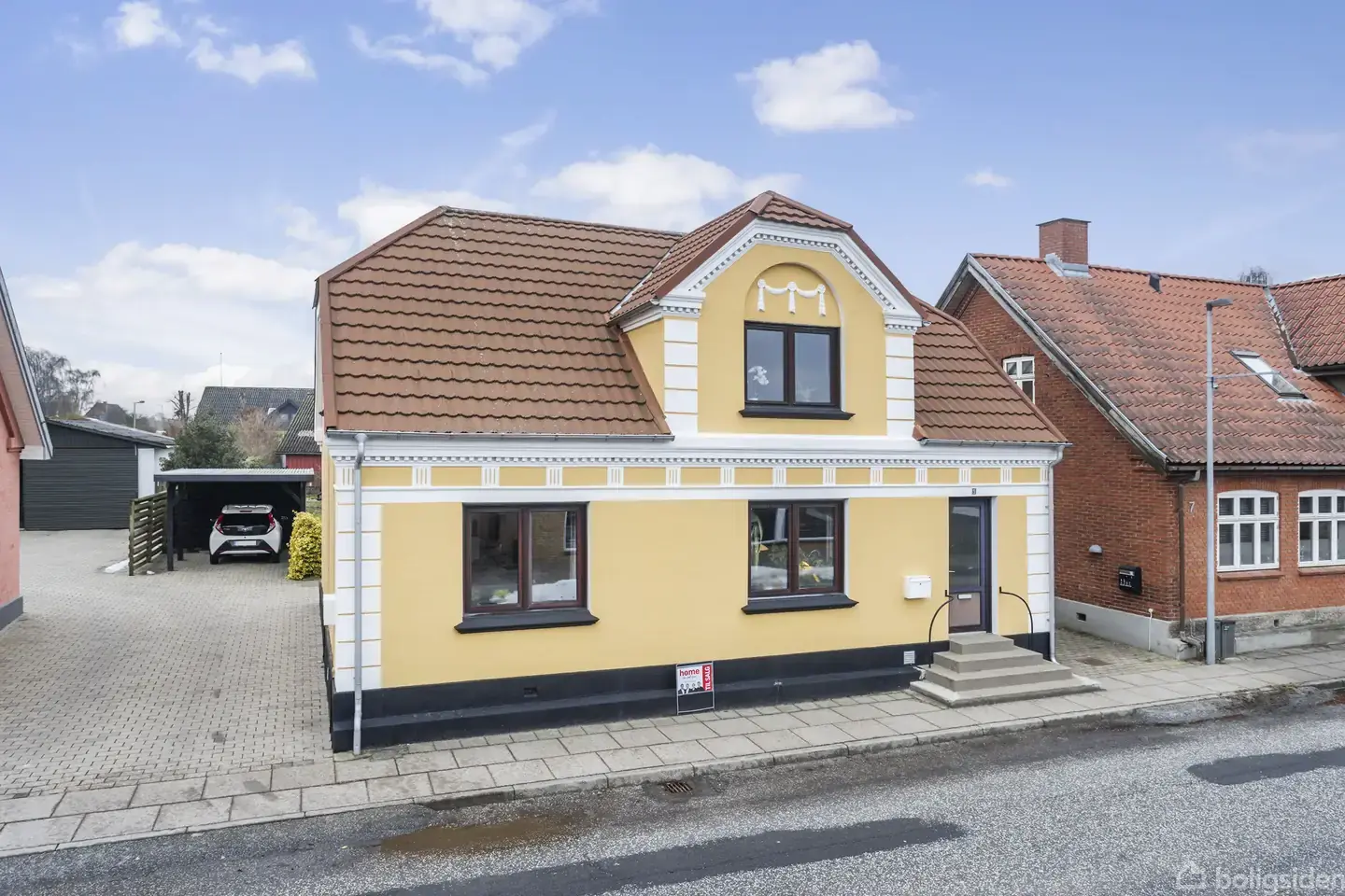 På Nørregade 5 i Hørby mødes man af en fin og indbydende ejendom, der med sin pudsede, gulmalede facade og fine hvide friser fremstår klassisk og velholdt. Det røde, tegllignende Decra-tag giver huset et solidt og harmonisk udtryk, som passer naturligt ind i gadebilledet, mens de vedligeholdelsesvenlige vinduer understøtter den praktiske hverdag. Her er tale om en ejendom med karakter, men også med en indretning, der åbner for flere anvendelsesmuligheder.Huset er opdelt i to separate lejligheder