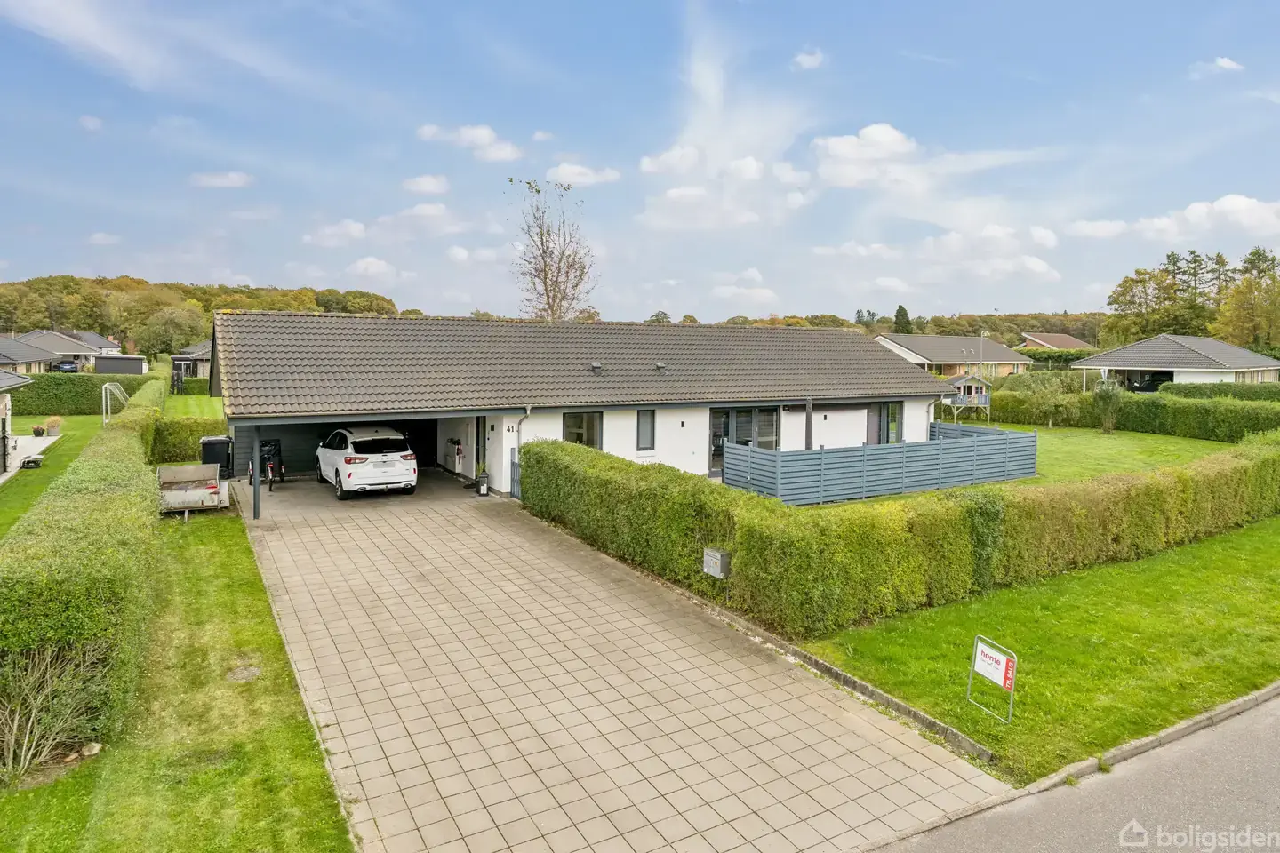 På det ellers etablerede Nørremarken finder du den nyere udstykning Nørreskov Huse, som blev etableret fra omkring 2011. Området er nu fuldt opvokset, og har en helt fantastisk beliggenhed i forhold til både natur, by og motorvejsnettet.Villaen her er opført i 2012 og byder på 130 m² boligareal med en optimal planløsning. Villaen fremstår, lys, velholdt og direkte indflytningsklar med gulvvarme i hele beboelsen. Du træder ind i villaen gennem et dejligt stort bryggers, som giver adgang til en fo