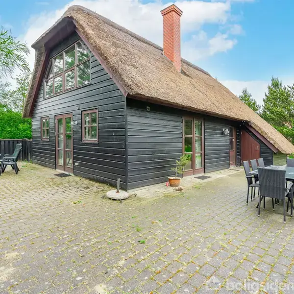 Flot fritidshus opført i 2004 i 2 plan beliggende i det skønne ferieområde, Lønne, i kort afstand til Blåbjerg Plantage, Vesterhavet samt det store, populære badeland SeaWest. Her er ligeledes blot ca. 3 km ind til Nr. Nebel, hvor der er gode indkøbsmuligheder. Sommerhuset er beliggende på en dejlig, lukket grund med masser af plads til at boltre sig på. Her er en god, grusbelagt indkørsel samt en stor, afskærmet terrasse mod sydvest. Stråtagets mønning er skiftet i 2023. Desuden et integreret, isoleret udhus. Huset er tilmeldt udlejning igennem Købmand fra 2025 i perioden maj til august og har indbragt kr. 36.000 til ejer. Huset fremtræder i en rigtig pæn og nydelig stand og er lige til at overtage. Der er indgang til huset via rummelig, klinkebelagt entré med garderobeplads. Pænt, lyst køkken med opvaskemaskine og spiseplads. Her er ligeledes opsat en energibesparende varmepumpe fra 2023 samt brændeovn ligeledes fra 2023. Fra opholdsrummet er der udgang til de ugenerte terrasser. I stueplan findes desuden et dejligt spabadeværelse med bruseniche, sauna samt vaskesøjle. Her er ydermere to store værelser med faste skabe og dobbeltseng. Der er gulvvarme i alle klinkebelægninger. 1. salen er indrettet med en rigtig hyggelig og pænt møbleret tv-stue med lofter til kip, hvorfra man kan nyde udsigten over den lukkede og ugenerte grund. Her er yderligere to værelser - begge med to sovepladser hver. Desuden et ekstra badeværelse med toilet. Et superflot og særdeles velholdt fritidshus med plads til hele familien.
