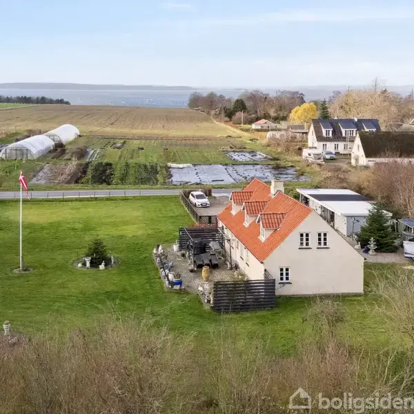 Villa på 154 m² med stor 2.364 m² grund og naturskøn, landlig beliggenhed Denne 154 m² villa fra 1904 blev renoveret i 1987 og ligger på en stor, velholdt grund på 2.364 m². Med sin beliggenhed i landlige omgivelser og udsigt over åbent landskab og fjord, tilbyder ejendommen et roligt og privat miljø med masser af plads. Den omgivende natur skaber en indbydende stemning allerede ved ankomst.Boligen er indrettet således: på stueplan findes et stort køkken-alrum med terrakottagulv, hvide vægge og