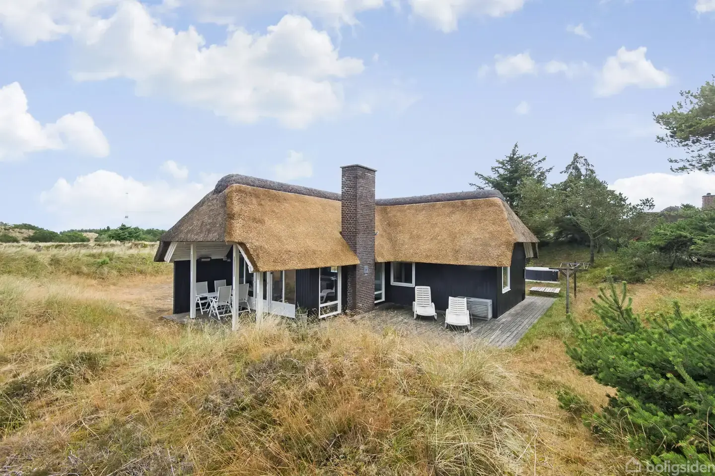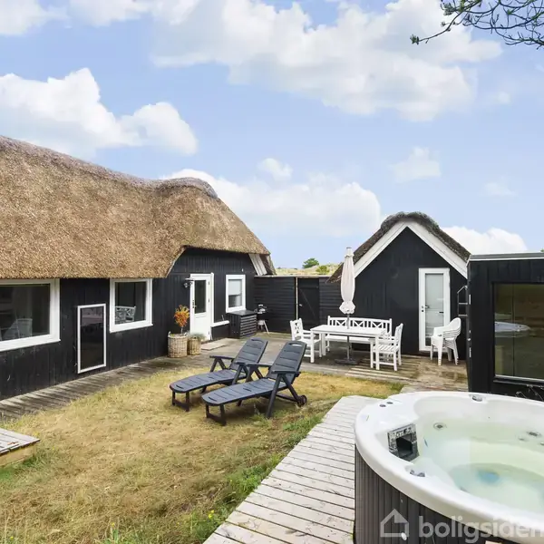 Dette charmerende sommerhus ligger lige midt i de smukke lyngarealer tæt på Blåvand fyr. Huset er smukt placeret på en dejlig afskærmet naturgrund, hvor klitter og vegetation skaber en fredfyldt og privat atmosfære med det åbne vestjyske hedelandskab som din nærmeste nabo.Huset er nænsomt renoveret i 2020 og fremstår med klassisk stråtag, hvide vinduer og sort facade, som harmonerer flot med det omgivelserne. Den åbne træterrasse med luksuriøst udemiljø binder inde og ude naturligt sammen. Inden