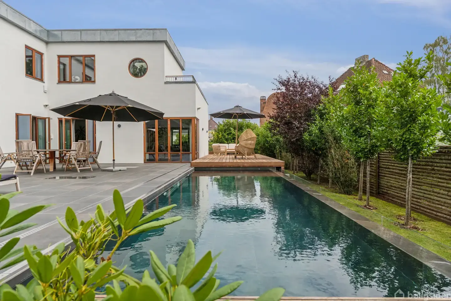 Unik funkisvilla på 584 etagemeter i boligstandard. Fra smukke mahognidetaljer og en elevator til en underjordisk garage med plads til 4-6 biler – her er alt, hvad man kan drømme om. Underetagen på hele 257 m2 er uden sidestykke og udendørs finder du en privat og ugeneret have omkranset af en hvid mur med el-port og et kæmpe sydvendt terrassemiljø med pool. 584 kvadratmeter i høj kvalitetVillaen er et imponerende syn ude såvel som inde, hvor kombinationen af uanede kvadratmeter og udsøgte materi