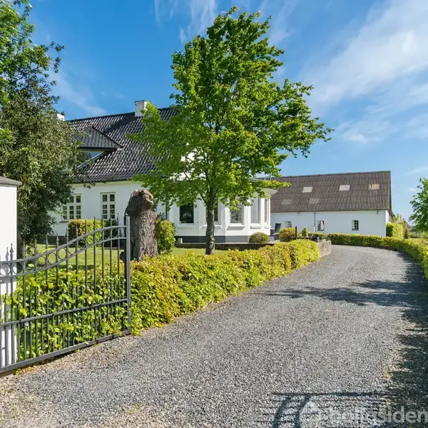 Det er muligt at tilkøbe et jordareal på godt 19 hektar. Udsigten fra denne elegante lystejendom er et skuestykke, de fleste kan fortabe sig i. Noget andet er unægteligt udsigten til fjorde og vige, hvor vandet bliver indrammet af landskab og skove, der forandrer sig i takt med årstidernes gang. Det er denne maleriske kulisse, der sætter prikken over i'et på denne adresse. For ejendommen i sig selv præsenterer sig også smukt og elegant med sit store, hvide stuehus, gode udbygninger, der indramm