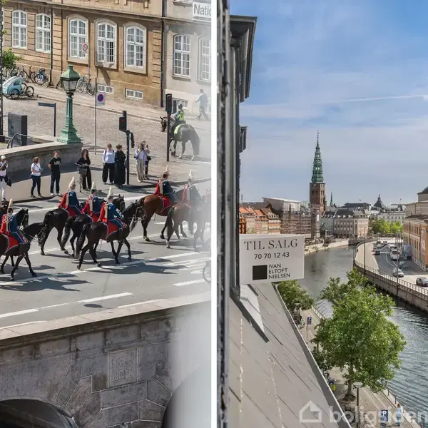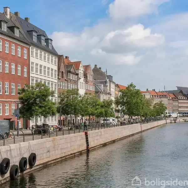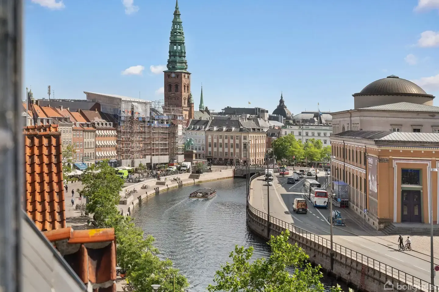 Fredet ejendom. Suk for en udsigt. Selvfølgelig ligger kulturministeriet her i Nybrogade, for kvarteret omkring er nok det kvarter i København, som har allermest kultur omkring sig. Ikke for at være ’name dropper’, som er det nydanske ord for at være dus med dyrene og de kendte, så ligger Thorvalsens Museum på den anden side af kanalen, det samme gør Nationalmuseet, Christiansborg Slot og Ridebane, Slotskirken, Slotholmen, Krigsmuseet og Børsen. Bare for at nævne de få. Nybrogade ligger langs kanalen og løber parallelt med Magstræde, der i lige linje bliver til Snaregade, som så som bliver til Gammel Strand. Indre By, når det er allermest Indre. Nybrogade fik sit navn efter en bro fra Slotsholmen til Knabrostræde. Broen blev kaldt Nybro, for den var jo ny, da den blev bygget i 1680’erne. Lejligheden Nybrogade 22 øverst oppe på 5. sal har udsigt til det hele, ja, nok en af de bedste udsigter til smukke tage og tårne i København. Tiden drypper lidt afsted i den her del af byen. Alle ejendommene er ældre. Naboen Gammel Strand er den mest solbeskinnede plads. Så attraktiv er Gammel Strand, at den sidste af de rapkæftede fiskerkællinger først forlod pladsen i 2008. Ejendommen er fra 1853, og Lejligheden er på 161 m2 med Dinesen plankegulve overalt på nær i badeværelser. Lækkert køkken, lækkert badeværelse, masser af lys. Helt ideel til bohemen, som vil det hele. Eller til kæresteri, som stadig krammer hinanden. Cocktailbaren Ruby’s ligger lige nede på gaden. Alt er lige til at flytte ind i. Nybrogade har en af de mest charmerende beliggenheder i København. Alt er lige om hjørnet, vandet i kanalen, restauranterne, caféerne, kulturen med museer, skuespil og ballet, og tæt på metroen. Kvarteret begyndte som Københavns første havn og var så vigtigt, at den blev lukket og sikret om natten i 1300-tallet ligesom byportene.