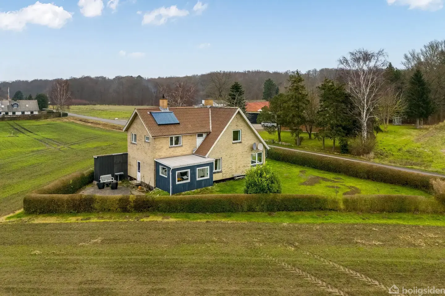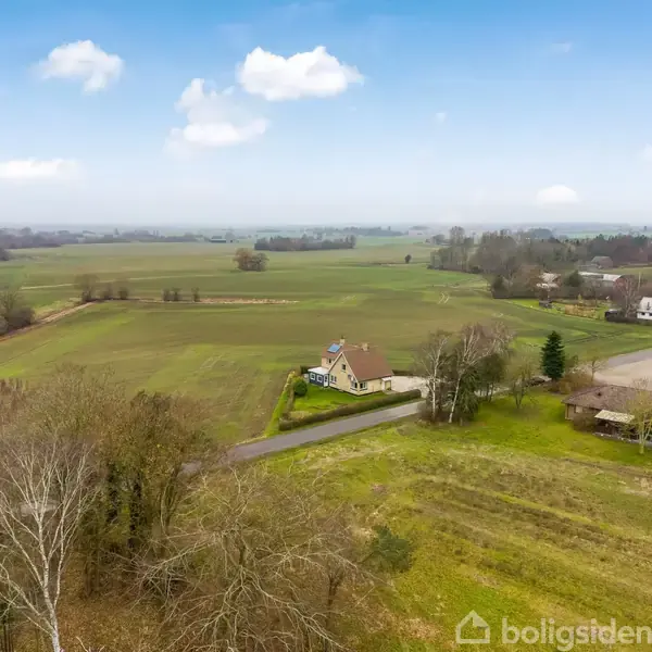 Huset ligger midt i det åbne landskab på Midtfalster, omgivet af marker hele vejen rundt og med skovbryn få hundrede meter fra ejendommen. Her er en helt særlig ro, hvor du hver dag kan følge årstidernes skiften på markerne, se råvildt i aftenskumringen og nyde de mest betagende solnedgange, der farver himlen i varme orange nuancer. Alligevel er hverdagen praktisk indrettet: Der er kun ca. 10 minutters kørsel til Nykøbing F., og herfra er der ikke langt til indkøb, skole og station i Eskilstrup. Motorvejen mod Rødby og København nås efter cirka 5 km. Hannenov Statsskov ligger kun få minutter fra huset, og du har desuden både Virket Lyng og skovbørnehaven Søruphus i nærområdet. Boligen rummer ca. 134 m² og opleves lys og imødekommende. I stueplan bliver du mødt af en entré/hall med trappe til førstesalen og videre adgang til et moderniseret køkken med god bordplads og lille spiseplads, hvor man nemt samles til dagens hurtige måltider. Herfra er der adgang til et rummeligt bryggers med vaskefaciliteter og masser af plads til hverdagens praktiske opbevaring. Husets hjerte er den store stue, hvor der både er plads til langt spisebord og stor sofagruppe, og hvor de store vinduer trækker udsigten til markerne helt ind i rummet. Den hyggelige brændeovn sørger for ekstra varme og stemning i de kølige måneder. I stueplan findes desuden et badeværelse med badekar og de originale, charmerende blå fliser samt adgang til et fyrrum. Fra stuen er der udgang til en dejlig, lys udestue på omkring 18 m², som nærmest fungerer som et ekstra opholdsrum det meste af året og giver første parket til naturen udenfor. På første sal venter en repos, tre gode værelser og endnu et badeværelse. Indretningen giver fine muligheder, uanset om du drømmer om børneværelser, kontor og gæsteværelse til helårsbrug, eller om huset primært skal fungere som flexbolig med plads til familie og venner i weekender og ferier. Udenfor er grunden anlagt enkelt med græs og hæk, så haven er nem at passe, og foran huset er der rigelig plads til parkering til biler, trailer og måske en campingvogn. Et udhus på ca. 27 m² samt overdækning giver yderligere plads til brænde, cykler og haveredskaber. Ejendommen har energimærke D, solpaneler på taget, opvarmning med olie og fibernet tilsluttet, så du er sikret en stabil og hurtig internetforbindelse – ideelt, hvis du vil kombinere hjemmearbejde med landlig idyl, eller hvis flexboligen også skal kunne bruges til lidt arbejde på afstand. Nybyvej 28 er kort sagt et sted, hvor du får følelsen af at være langt ude på landet, men stadig har byen og infrastrukturen lige inden for rækkevidde – en sjælden kombination af udsigt, ro og funktionel bolig, der kan bruges præcis, som dit liv og dine drømme kræver det.
