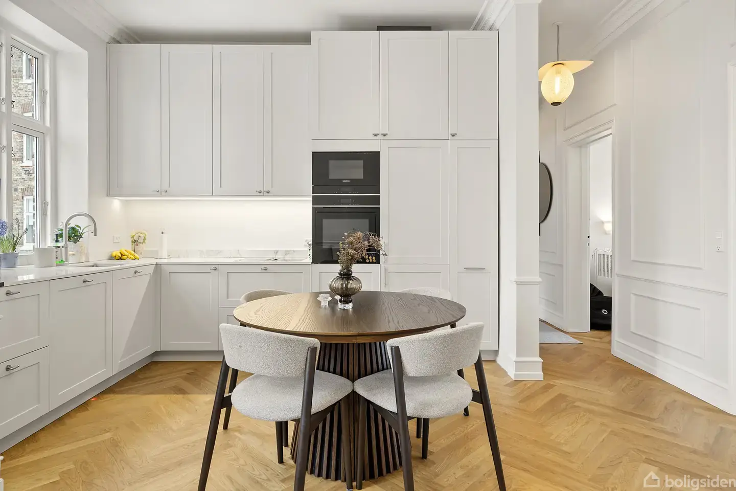 Umådelig flot og toptunet herskabslejlighed på rolig stikvej på FrederiksbergDet er altså svært ikke at falde pladask for en lejlighed som denne pragtfulde 4V på Frederiksberg. Totalrenoveret for nylig med blandt andet solide snedkerløsninger i køkken, badeværelse og i de indbyggede skabe. Lækre materialer fra enden til anden såsom massiv sildebensparket i eg og en stilfuld Dekton-bordplade i køkkenet. Og så beliggenheden på en fredelig stikvej til Nyelandsvej tæt på metro (begge linjer), Freder